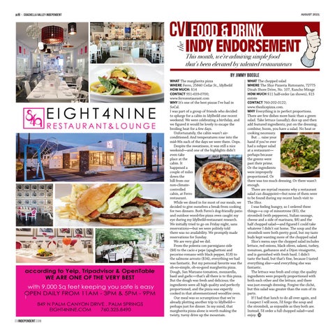 according to Yelp, Tripadvisor & OpenTable WE ARE ONE OF THE VERY BEST with 9,000 Sq feet keeping you safe is easy OPEN DAILY FROM 11AM - 3PM & 5PM - 9PM 849 N PALM CANYON DRIVE . PALM SPRINGS EIGHT4NINE.COM 760.325.8490 CVIndependent.com