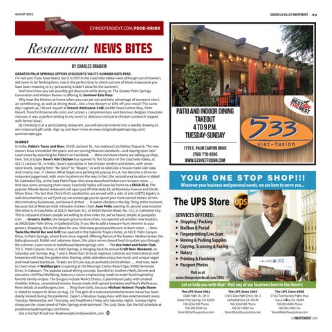 Restaurant NEWS BITES By charles drabkin GREATER PALM SPRINGS OFFERS DISCOUNTS VIA ITS SUMMER EATS PASS I’m not sure if you have heard, but it is HOT in the Coachella Valley—and although out-of-towners still seem to be flocking here, now is the perfect time to check out one of those restaurants you have been meaning to try (presuming it didn’t close for the summer). And here’s how you can possibly get discounts while doing so: The Greater Palm Springs Convention and Visitors Bureau is offering its Summer Eats Pass! Why heat the kitchen at home when you can eat out and take advantage of someone else’s air conditioning, as well as dining deals—like a free dessert or 10% off your meal? The same day I signed up, I found myself at French Rotisserie Café (44489 Town Center Way, Palm Desert; frenchrotisseriecafe.com) and scored a complimentary and delicious Belgian chocolate mousse; it was a perfect ending to my lunch (a delicious rotisserie chicken sandwich topped with fennel slaw). By checking in at a participating restaurant, you will also be entered into a weekly drawing to win restaurant gift cards. Sign up and learn more at www.visitgreaterpalmsprings.com/ summer-eats-gps. IN BRIEF In Indio, Pablo’s Tacos and Beer, 42425 Jackson St., has replaced Los Pablos Taqueria. The new owners have remodeled the space and are serving Mexican standards—and staying open late! Learn more by searching for Pablo’s on Facebook. … More and more chains are setting up shop here. SoCal staple Dave’s Hot Chicken has opened its first location in the Coachella Valley, at 42213 Jackson St., in Indio. Dave’s specializes in hot chicken tenders and sliders, with seven spice levels, ranging from “No Spice” to “Reaper,” as well as sides like a house-made kale slaw and creamy mac ’n’ cheese. What began as a parking-lot pop-up in L.A. has become a 20-or-sorestaurant juggernaut, with more locations on the way; in fact, the second area location is slated for Cathedral City, at the Date Palm Plaza. Visit www.daveshotchicken.com to learn more. … And now some annoying chain news: Coachella Valley will soon be home to a Chick-fil-A. The popular Atlanta-based restaurant will open just off Interstate 10, at Monterey Avenue and Dinah Shore Drive. The fact that Chick-fil-A’s sandwiches are served with a side of anti-LGBTQ bigotry is well-documented, so we’ll just say we encourage you to spend your hard-earned dollars at nondiscriminatory businesses, and leave it at that. … It seems chicken is the Big Thing at the moment, because SoCal Mexican-style rotisserie chicken chain Juan Pollo opening its second area location (the other is in Coachella, at 50225 Harrison St.), at 69160 Ramon Road, No. 101, in Cathedral City. This is rotisserie chicken people are willing to drive miles for, we’ve heard; details at juanpollo. com. … Grocery Outlet, the bargain grocery-store chain, has opened yet another new location, at 30025 Date Palm Drive, in Cathedral City. If you like to add a treasure-hunt element to your grocery shopping, this is the place for you. Visit www.groceryoutlet.com to learn more. … New: Taste the World Bar and Grill has opened in the Caliente Tropics Hotel, at 411 E. Palm Canyon Drive, in Palm Springs, where Evzin once reigned. Offering flavors of the Eastern Mediterranean like baba ghanoush, falafel and Lebanese stews, this place serves desert food to sustain you through the summer. Learn more at tastetheworldpalmsprings.com. … The Ace Hotel and Swim Club, 701 E. Palm Canyon Drive, in Palm Springs, is bringing back its annual Craft Beer Weekend, on Saturday and Sunday, Aug. 7 and 8. More than 30 local, regional, national and international craft breweries will keep the golden elixir flowing, while attendees enjoy live music and unique vegan and meat-based barbecue. Tickets are $75 per day at acehotel.com/craftbeer. … And now, back to chain news: A Wahlburgers is opening at the Morongo Casino Resort Spa, 49500 Seminole Drive, in Cabazon. The popular casual-dining concept, founded by brothers Mark, Donnie and executive chef Paul Wahlberg, features a menu emphasizing made-to-order food inspired by favorite family recipes. The burgers include Mark’s Choice: a plant-based patty with smoked cheddar, lettuce, caramelized onions, house-made chili-spiced tomatoes and Paul’s Wahlsauce. More details at wahlburgers.com. … Ring them bells, because Michael Holmes’ Purple Room is slated to reopen its doors on Aug. 31! This gem of a restaurant/entertainment venue has been dearly missed during the pandemic. Expect a fabulous happy hour with live entertainment every Tuesday, Wednesday and Thursday, and headliners Friday and Saturday nights. Sunday nights showcase the crown jewel of Palm Springs entertainment: The Judy Show. Get the full schedule at purpleroompalmsprings.com/home. Got a hot tip? Email me: foodnews@cvindependent.com.