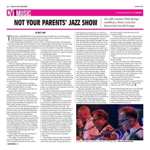 the first couple of Jazzville shows at the performing are younger than me, and I’m in Cascade Lounge. my mid-30s. This is stuff that has always had a “I kind of expected an older, retirement-age place in musicians’ and aficionados’ hearts, and crowd to be there, and I was very pleasantly what we’re doing is bringing that culture to surprised to see that nearly half the crowd was Palm Springs and making it hip again. We have younger couples and younger people who were a lot of young folks coming in, and (one of the in their late 20s and early 30s,” said Stephenie first shows back), about 50% of the room were Streiff-Process, director of marketing at Agua in their 20s. I feel like what we’re trying to Caliente Palm Springs. “It’s encouraging to accomplish here translates to the rock ’n’ roll watch a younger generation just fall in love demographic, rockabilly and even metal. When with or continue to love what’s truly the most you listen to heavy metal, the technicalities unique art form to come out of the United of playing are the same in jazz music. We’re States.” trying to spread awareness of not only the Martin said the Cascade Lounge is a perfect music, but the whole vibe and the culture fit for Jazzville. that Palm Springs brings in creating that “That was the only room in Palm Springs experience. You can watch jazz anywhere for free, but we’re trying to give you the experience, that I really wanted,” Martin said. “There’s no and I feel like that’s really our biggest mission.” other room in Palm Springs like it as far as seating, comfort, the look and feel of the room, Martin said jazz music has always been hip. the service, the stage and the lights, the staff, “It’s the audience that became un-hip, so and everything. It was either build something we’re got to make them hip again,” Martin from the ground up, or go to that space—and said. “Jazz was the only music that people when it was offered, I was thrilled.” used to listen to; there was nothing else on Martin said he’s proud to be continuing the radio. Everything came out of jazz—R&B, Palm to Springs’ jazz history. soul and pop music. It’sSafety the beginning it all, From Netofprograms Lifeproud Enrichment “Our mission is to make more jazz lovers out and it has a very illustrious history. There are a of people who would love jazz if they would lot of styles of jazz, so we focus on everything only go to one show,” Martin said. that’s perfectly in the middle. We don’t do lazy jazz, and we don’t do loud, crazy jazz. Jazzville Palm Springs takes place every Thursday “We did a Jazzville at The Abbey in West at 7 p.m. at the Cascade Lounge, inside Agua Hollywood, and Lady Gaga was in the audience Caliente Palm Springs, 401 E. Amado Road. for that show. We had a nice little gypsy jazz Tickets start at $10. Upcoming shows include trio on a beautiful Sunday afternoon outside The Abbey, and The Abbey is now interested in Angel Town Combo on Aug. 5; Pino Noir Quartet on Aug. 12; Conganas on Aug. 19; and Nutty on having a regular thing happening there.” Aug. 26. For tickets or more information, visit Management at the Agua Caliente Palm www.jazzvillepalmsprings.com. Springs has liked what they’ve seen during