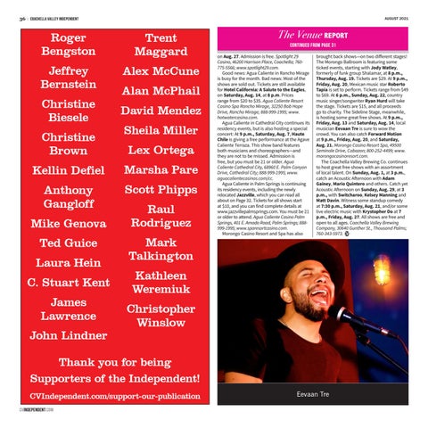 The Venue REPORT continued from page 31 on Aug. 27. Admission is free. Spotlight 29 Casino, 46200 Harrison Place, Coachella; 760775-5566; www.spotlight29.com. Good news: Agua Caliente in Rancho Mirage is busy for the month. Bad news: Most of the shows are sold out. Tickets are still available for Hotel California: A Salute to the Eagles, on Saturday, Aug. 14, at 8 p.m. Prices range from $20 to $35. Agua Caliente Resort Casino Spa Rancho Mirage, 32250 Bob Hope Drive, Rancho Mirage; 888-999-1995; www. hotwatercasino.com. Agua Caliente in Cathedral City continues its residency events, but is also hosting a special concert: At 9 p.m., Saturday, Aug. 7, Haute Chile is giving a free performance at the Agave Caliente Terraza. This show band features both musicians and choreographers—and they are not to be missed. Admission is free, but you must be 21 or older. Agua Caliente Cathedral City, 68960 E. Palm Canyon Drive, Cathedral City; 888-999-1995; www. aguacalientecasinos.com/cc. Agua Caliente in Palm Springs is continuing its residency events, including the newly relocated Jazzville, which you can read all about on Page 32. Tickets for all shows start at $10, and you can find complete details at www.jazzvillepalmsprings.com. You must be 21 or older to attend. Agua Caliente Casino Palm Springs, 401 E. Amado Road, Palm Springs; 888999-1995; www.sparesortcasino.com. Morongo Casino Resort and Spa has also