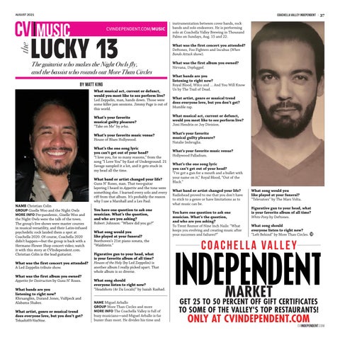 Figurative gun to your head, what is your favorite album of all time? Houses of the Holy (by Led Zeppelin) is another album I really picked apart. That whole album is so diverse. What song should everyone listen to right now? “Headshots (4r Da Locals)” by Isaiah Rashad. NAME Miguel Arballo GROUP More Than Circles and more MORE INFO The Coachella Valley is full of busy musicians—and Miguel Arballo is far busier than most. He divides his time and