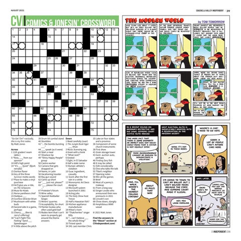 35 Lake on four states and a province 36 Component of some church instruments 38 First show 41 Grain storage tower 43 Govt. auction auto, perhaps 46 Finding Dory fish 48 It may be called 51 Edit considerably 53 One who talks the talk 55 Tibet’s neighbor 57 Opening notes 58 Win all the games 59 Brief 60 Most of a penny’s makeup 61 From a long way 63 Singer Lovato who announced their new pronouns in 2021 66 Lincoln’s son 68 Chow down, slangily 69 Amphibious WWII vessel © 2021 Matt Jones Find the answers in the “About” section at CVIndependent.com!