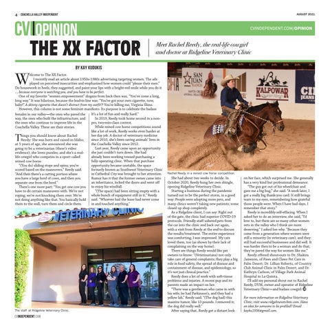 elcome to The XX Factor. I recently read an article about 1950s-1980s advertising targeting women. The ads played on perceived insecurities and emphasized how women could “please their men.” Do housework in heels, they suggested, and paint your lips with a bright-red smile while you do it … because everyone is watching you, and you have to be perfect. One of my favorite “women empowerment” slogans from back then was, “You’ve come a long, long way.” It was hilarious, because the lead-in line was: “You’ve got your own cigarette, now, baby!” A skinny cigarette that doesn’t distract from my outfit?! You’re killing me, Virginia Slims. However, this column is not some feminist manifesto. Its purpose is to celebrate the badass It’s a lot of fun and really hard.” females in our valley—the ones who paved the In 2019, Reedy took home second in a nonway, the ones who built the infrastructure, and pro, two-rein-class contest. the ones who continue to improve life in the While reined cow horse competitions sound Coachella Valley. These are their stories. like a lot of work, Reedy works even harder at her day job. A doctor of veterinary medicine hings you should know about Rachel since 2010, she’s been saving animals’ lives in Reedy: She was born and raised in Idaho; the Coachella Valley since 2012. at 5 years of age, she announced she was Last year, Reedy came upon an opportunity going to be a veterinarian (there’s video she just couldn’t turn down. She had evidence); she loves puzzles; and she’s a realalready been working toward purchasing a life cowgirl who competes in a sport called fully operating clinic. When that purchase reined cow horse. opportunity became unstable, the space “(You do) sliding stops and spins; you’re formerly known as Southwest Veterinary Clinic scored based on the maneuvers,” Reedy said. in Cathedral City was brought to her attention. “And then there’s a cutting portion where Rumor has it that the former owner came into you have a large herd of cows, and then you an inheritance, locked the doors and went off separate one from the herd.” There’s one more part: “You get one cow you to enjoy his windfall. “(The space) had been sitting empty with a have to do certain maneuvers with. We’re not whole bunch of equipment still in it,” Reedy roping; we’re not knocking them over. We’re not doing anything like that. You basically hold said. “Whoever had the lease had never come in and touched anything.” them to the wall, turn them and circle them.