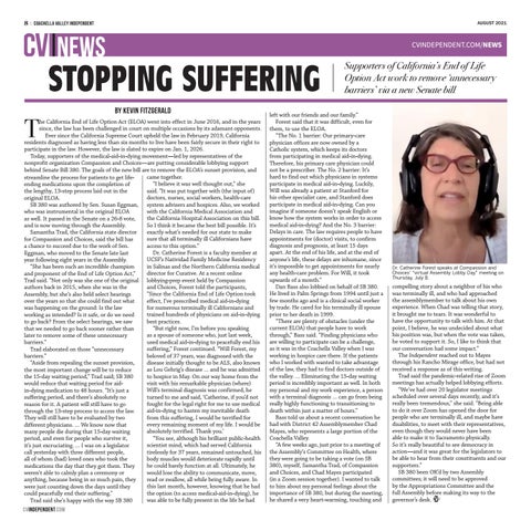 he California End of Life Option Act (ELOA) went into effect in June 2016, and in the years since, the law has been challenged in court on multiple occasions by its adamant opponents. Ever since the California Supreme Court upheld the law in February 2019, California residents diagnosed as having less than six months to live have been fairly secure in their right to participate in the law. However, the law is slated to expire on Jan. 1, 2026. Today, supporters of the medical-aid-in-dying movement—led by representatives of the nonprofit organization Compassion and Choices—are putting considerable lobbying support behind Senate Bill 380. The goals of the new bill are to remove the ELOA’s sunset provision, and came together. streamline the process for patients to get life“I believe it was well thought out,” she ending medications upon the completion of said. “It was put together with (the input of) the lengthy, 13-step process laid out in the doctors, nurses, social workers, health-care original ELOA. SB 380 was authored by Sen. Susan Eggman, system advisers and hospices. Also, we worked with the California Medical Association and who was instrumental in the original ELOA the California Hospital Association on this bill. as well. It passed in the Senate on a 26-8 vote, So I think it became the best bill possible. It’s and is now moving through the Assembly. exactly what’s needed for our state to make Samantha Trad, the California state director sure that all terminally ill Californians have for Compassion and Choices, said the bill has access to this option.” a chance to succeed due to the work of Sen. Dr. Catherine Forest is a faculty member at Eggman, who moved to the Senate late last UCSF’s Natividad Family Medicine Residency year following eight years in the Assembly. in Salinas and the Northern California medical “She has been such an incredible champion director for Curative. At a recent online and proponent of the End of Life Option Act,” Trad said. “Not only was she one of the original lobbying-prep event held by Compassion and Choices, Forest told the participants, authors back in 2015, when she was in the “Since the California End of Life Option took Assembly, but she’s also held select hearings effect, I’ve prescribed medical aid-in-dying over the years so that she could find out what for numerous terminally ill Californians and was happening on the ground: Is the law trained hundreds of physicians on aid-in-dying working as intended? Is it safe, or do we need best practices. to go back? From the select hearings, we saw “But right now, I’m before you speaking that we needed to go back sooner rather than as a spouse of someone who, just last week, later to remove some of these unnecessary used medical aid-in-dying to peacefully end his barriers.” suffering,” Forest continued. “Will Forest, my Trad elaborated on those “unnecessary beloved of 37 years, was diagnosed with the barriers.” disease initially thought to be ALS, also known “Aside from repealing the sunset provision, as Lou Gehrig’s disease … and he was admitted the most important change will be to reduce to hospice in May. On our way home from the the 15-day waiting period,” Trad said; SB 380 visit with his remarkable physician (where) would reduce that waiting period for aidWill’s terminal diagnosis was confirmed, he in-dying medication to 48 hours. “It’s just a turned to me and said, ‘Catherine, if you’d not suffering period, and there’s absolutely no fought for the legal right for me to use medical reason for it. A patient will still have to go aid-in-dying to hasten my inevitable death through the 13-step process to access the law. from this suffering, I would be terrified for They will still have to be evaluated by two every remaining moment of my life. I would be different physicians. … We know now that absolutely terrified. Thank you.’ many people die during that 15-day waiting “You see, although his brilliant public-health period, and even for people who survive it, scientist mind, which had served California it’s just excruciating. … I was on a legislator tirelessly for 37 years, remained untouched, his call yesterday with three different people, body muscles would deteriorate rapidly until all of whom (had) loved ones who took the he could barely function at all. Ultimately, he medications the day that they got them. They would lose the ability to communicate, move, weren’t able to calmly plan a ceremony or read or swallow, all while being fully aware. In anything, because being in so much pain, they this last month, however, knowing that he had were just counting down the days until they the option (to access medical-aid-in-dying), he could peacefully end their suffering.” was able to be fully present in the life he had Trad said she’s happy with the way SB 380 CVIndependent.com