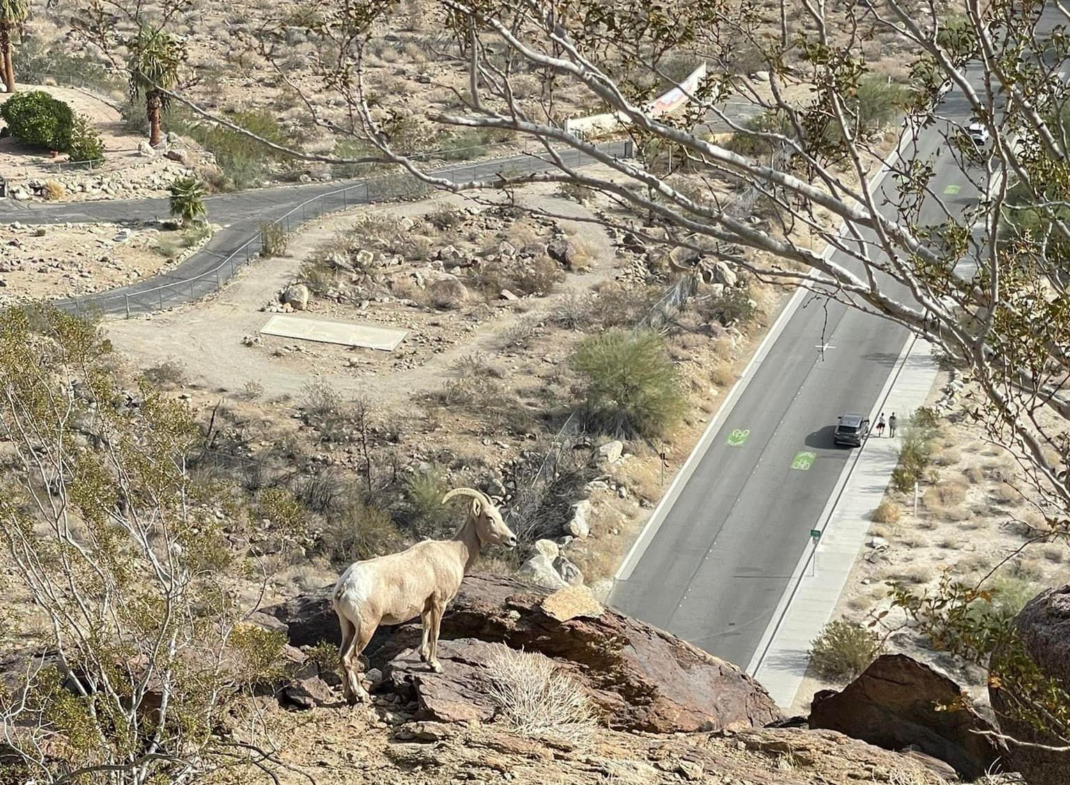 A bighorn sheep overlooking the streets just above Mesquite Avenue along the South Lykken Trail. Texie Pastorok