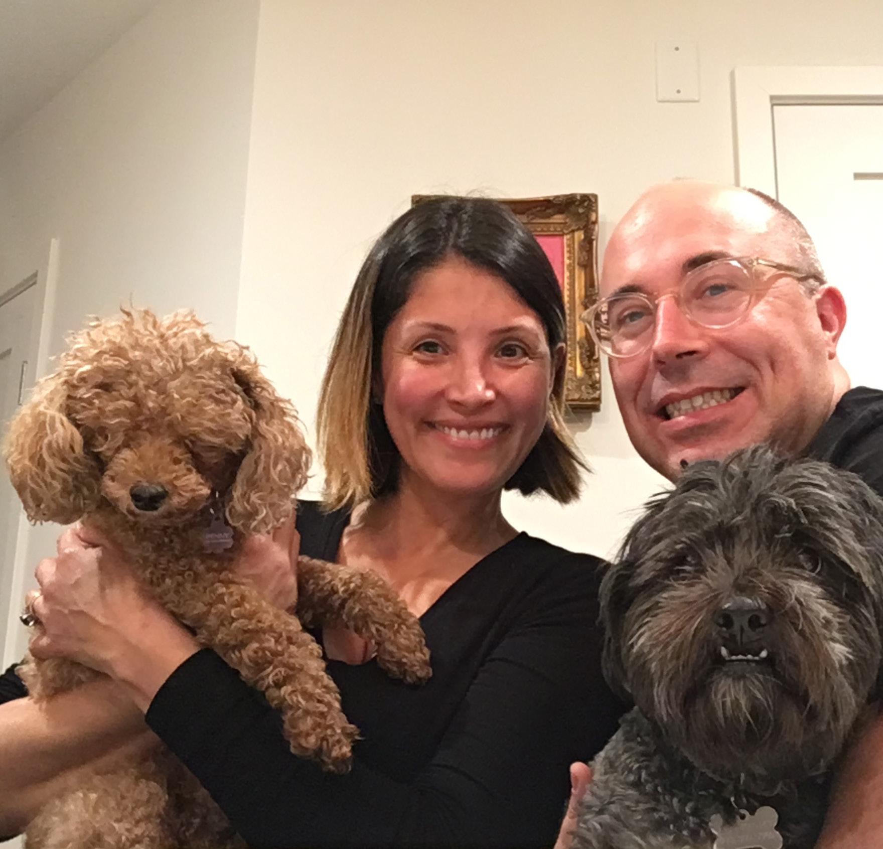 Claudia and Matt Snyder with their dogs, Penny and Benji.