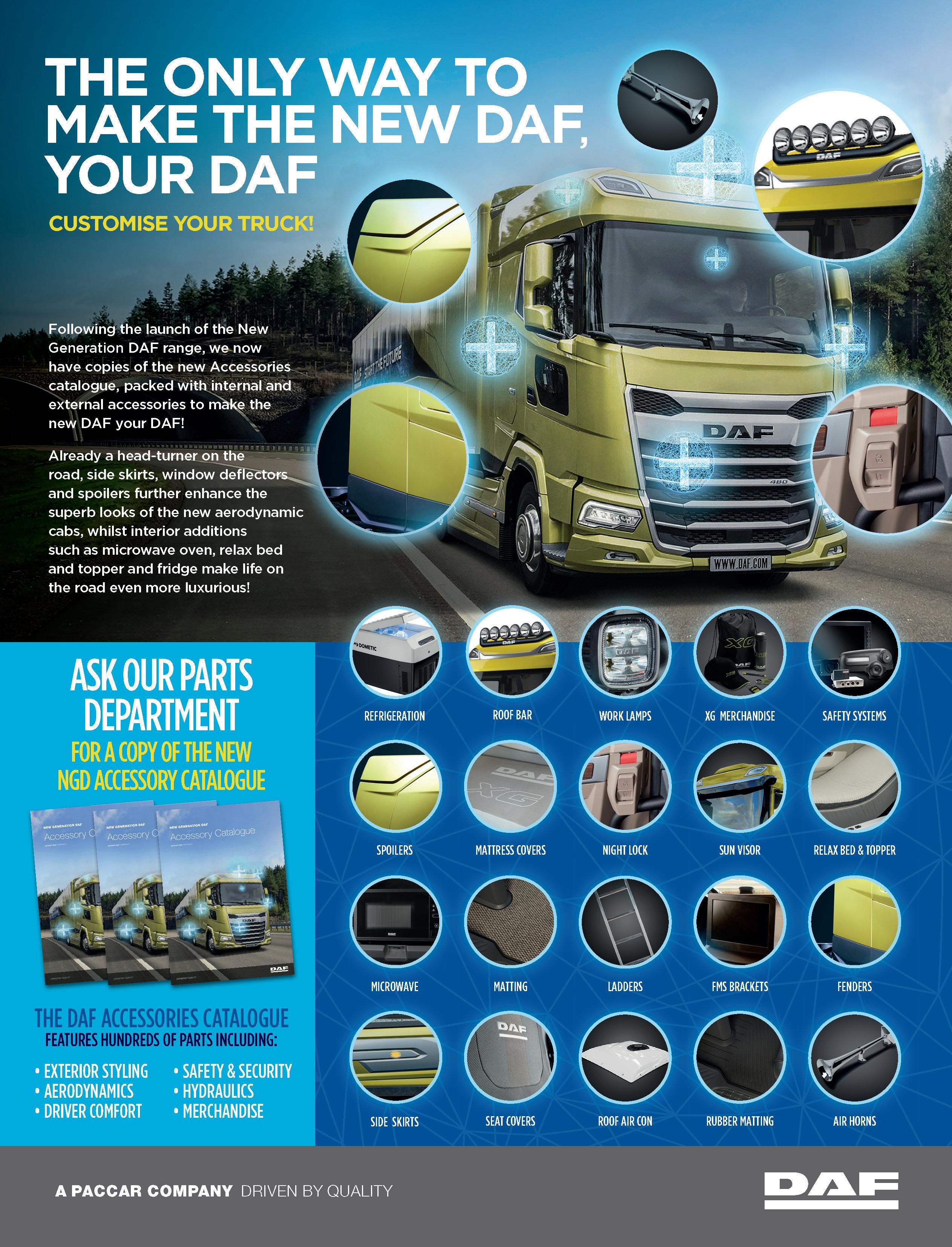 Terms & Conditions: Not suitable for children under 14 years of age. The winner will be notified within 30 days of the closing date either by letter, telephone or email. All entrants will be placed in a hat and selected at random by a third party. No money alternative will be offered. The winner’s name and county will be displayed in the next issue of DAF Driver magazine.