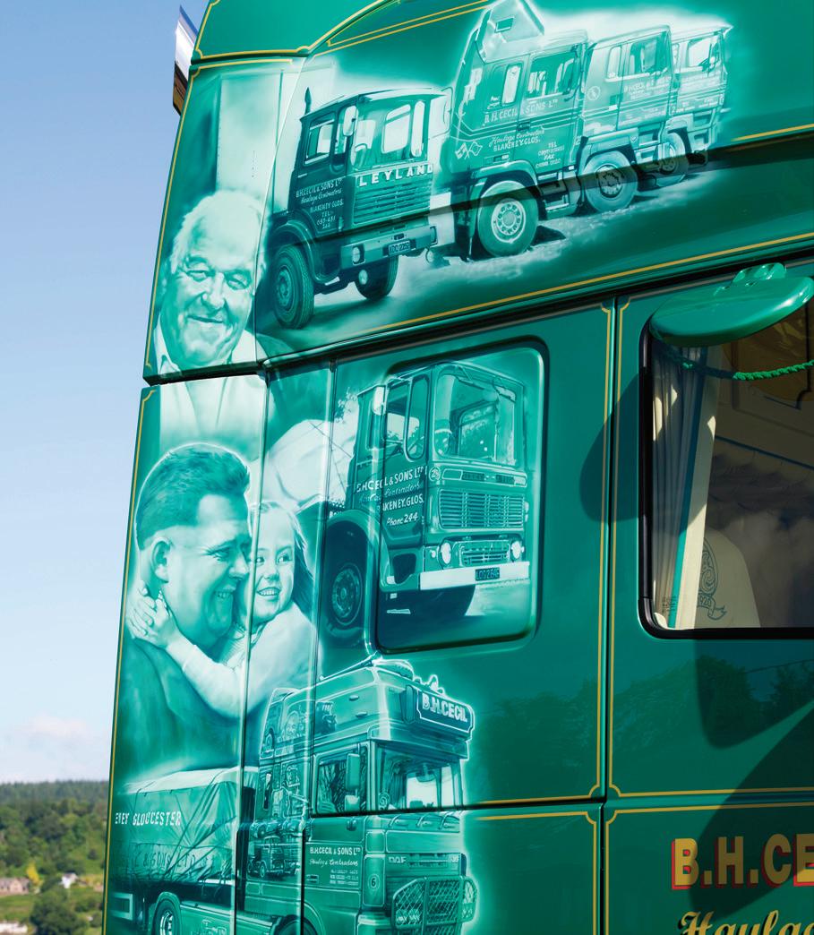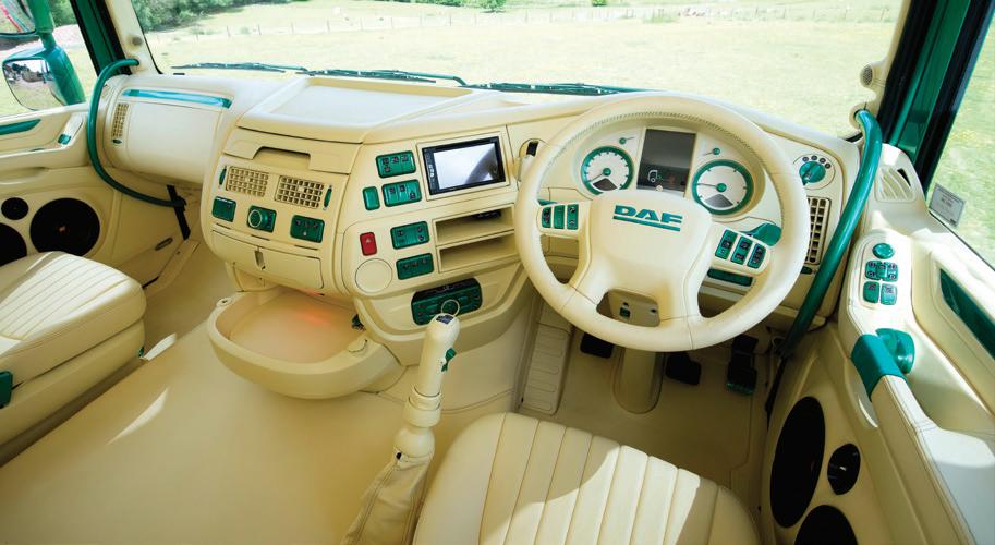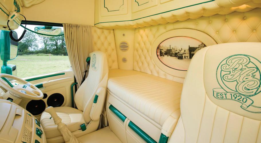 Based in Blakeney in the Forest of Dean, BH Cecil & Sons vehicles have been a common site on the lanes of Gloucestershire since 1920. Paul Cecil, the ‘gaffer’ who took over the reins of the business in 2008, waxes lyrical about the family’s history in transport. The company was founded in 1920 by his great grandfather and by way of a tribute to the family firm’s centenary, Paul has dedicated his latest DAF XF to the history of the business. The truck tells the story through fantastically executed airbrushing by top truck artist Adam Haden, who graphically catalogues a beautiful selection of classic commercial vehicles used in the fleet since its humble beginnings. As well as the exterior, the interior has also received special attention, which would put the most opulent 5-star hotel room to shame.