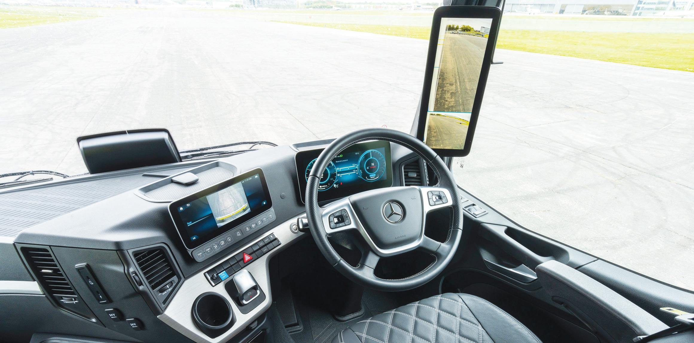 The air-suspended ClassicSpace 2.3 m wide M-Cab will be familiar to anyone who’s driven the diesel version. Inside is Merc’s 12.3-inch MultiMedia Cockpit with central dash-mounted infotainment screen, though this is augmented with a few extra screens detailing energy flow and battery charge level. At the start of our run, the truck was charged to 84% – plenty to get us to Rivington, despite the harsh headwind and driving rain.
