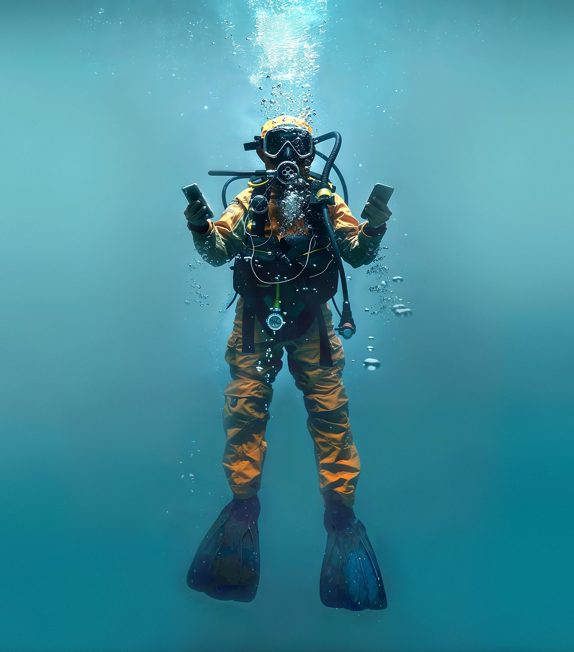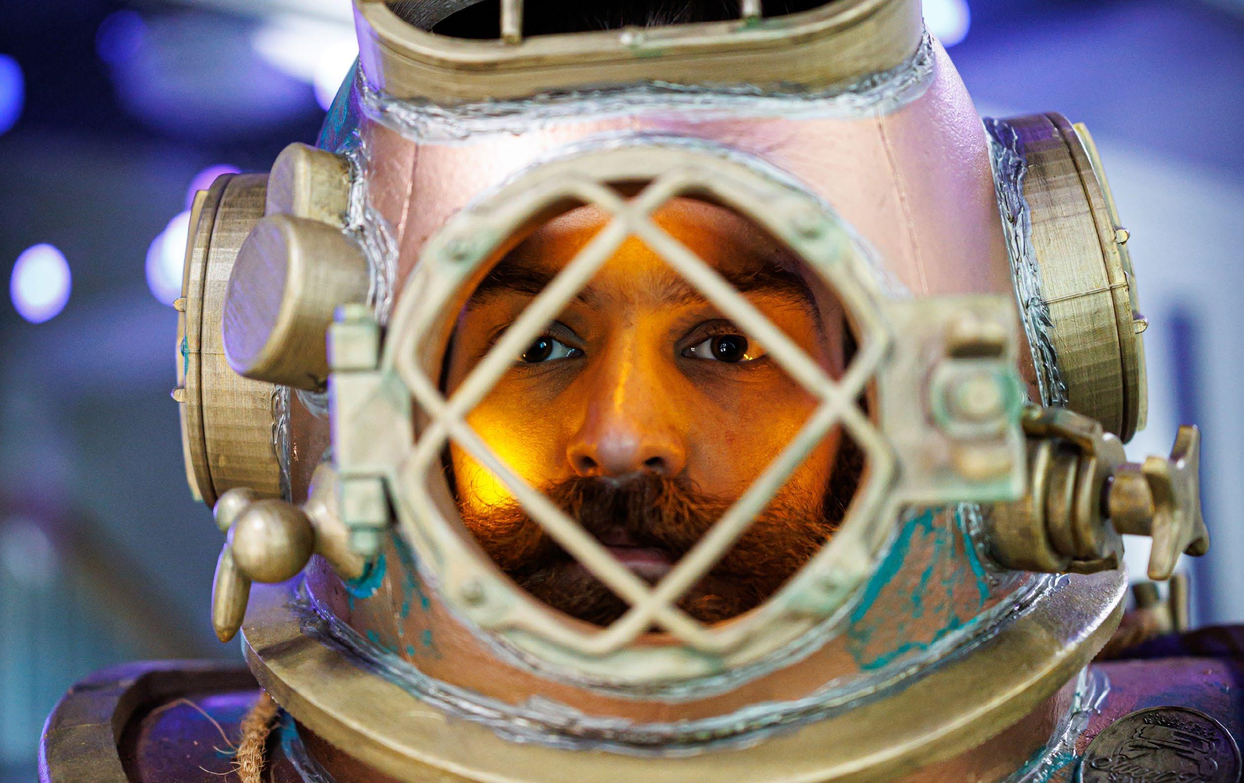 Artist Mathew McDonald wears a vintage diving helmet he made for Sweet Tea Shakespeare’s 2023 production of “20,000 Leagues Under the Sea."