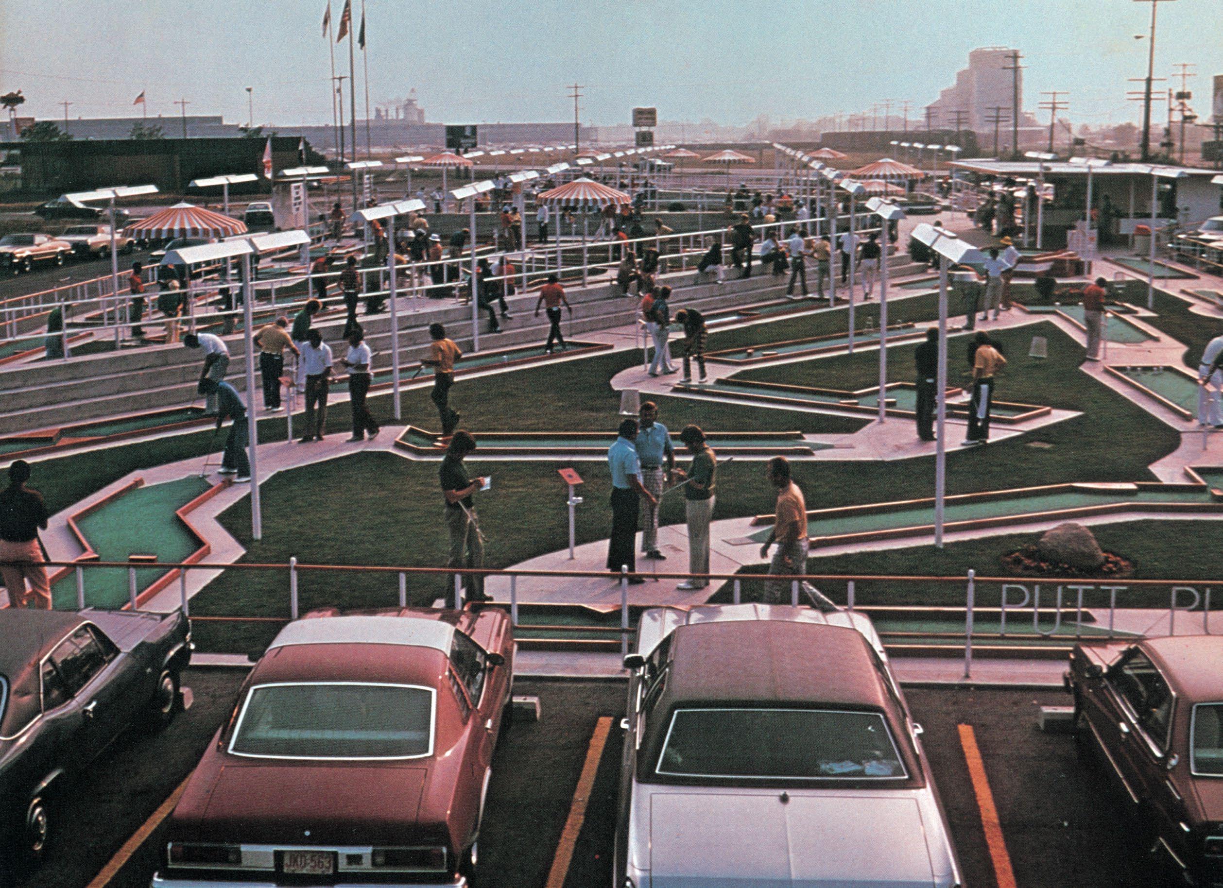 composite wood gives way to the original styling of bright orange aluminum railings on the Putt-Putt course in Fayetteville.