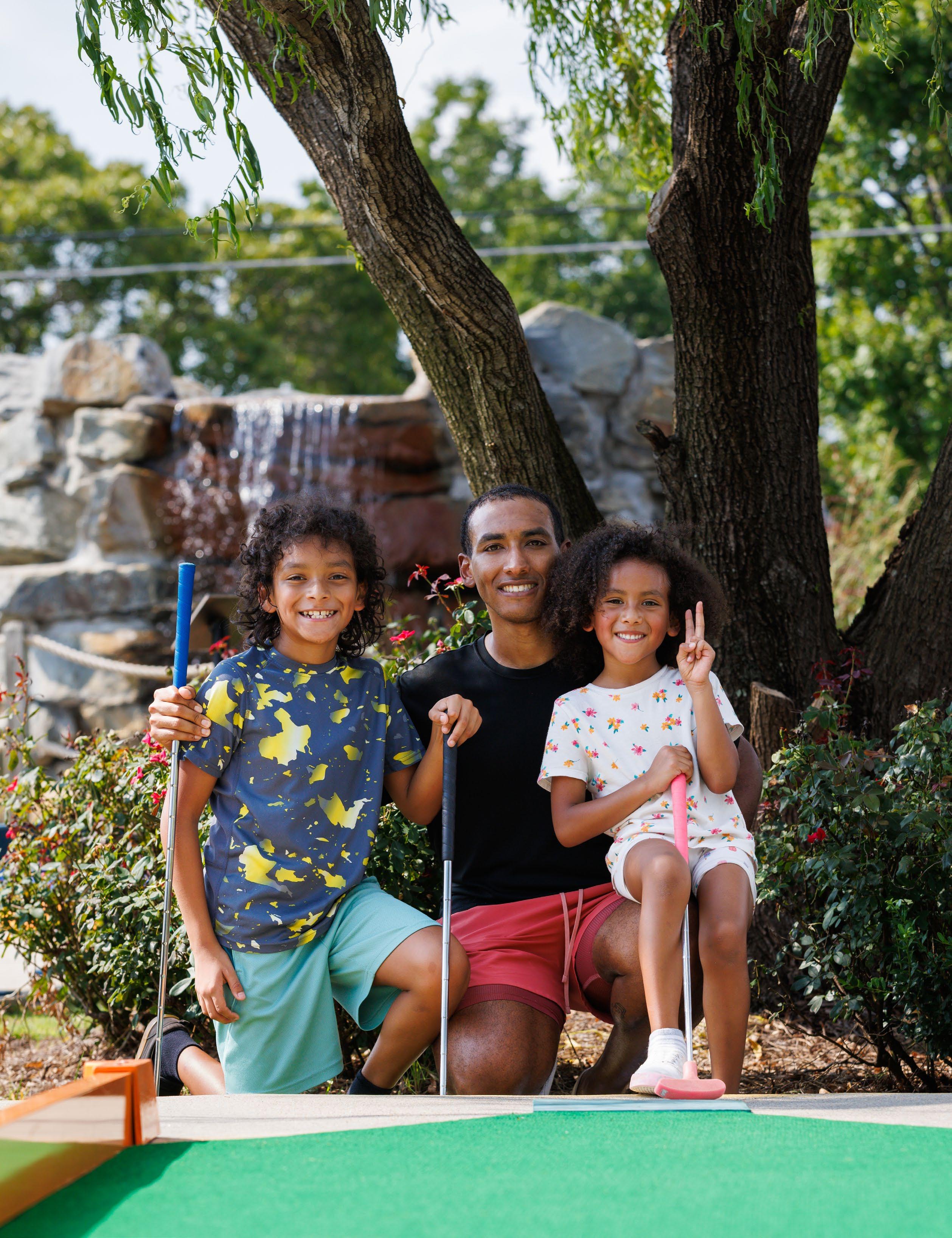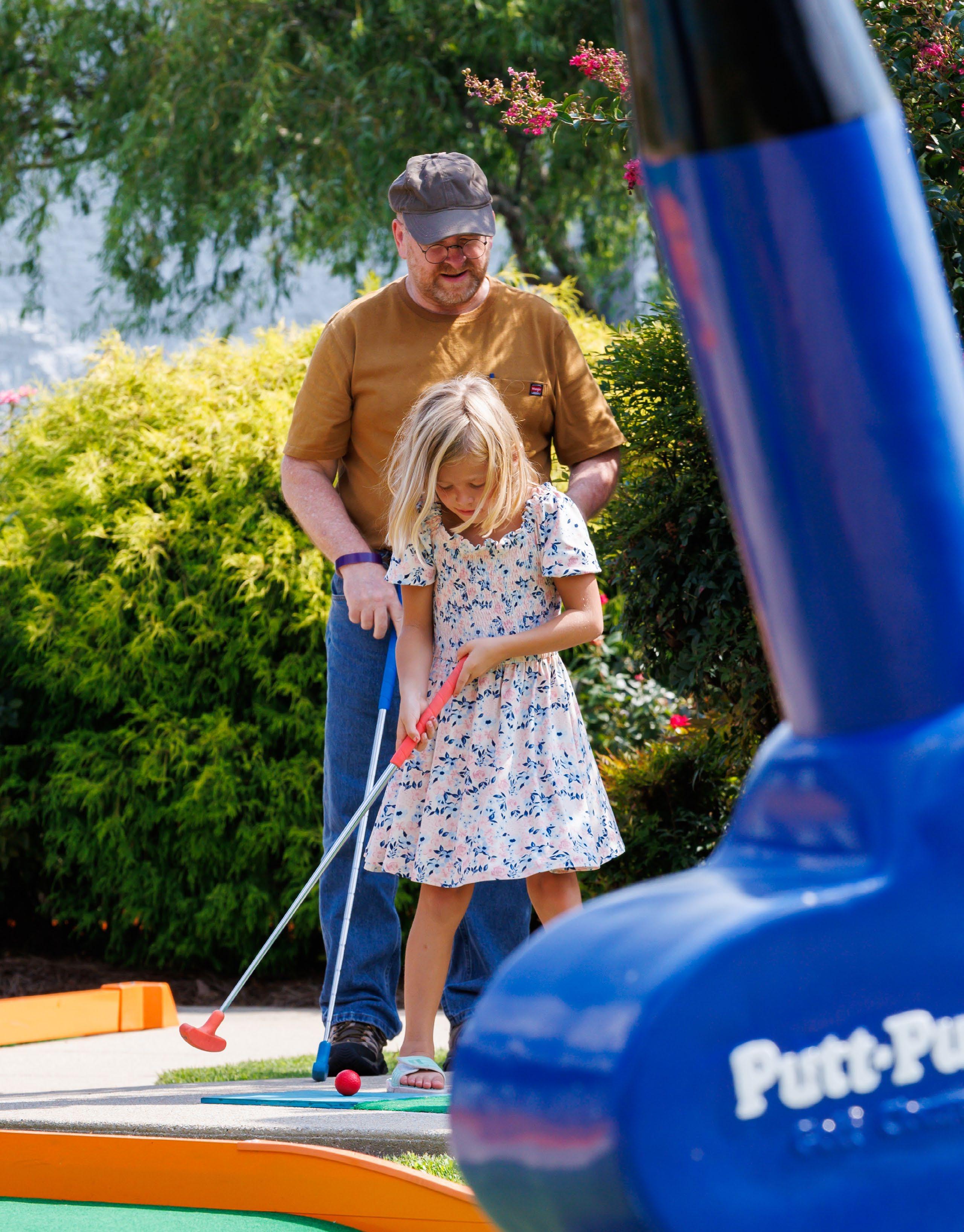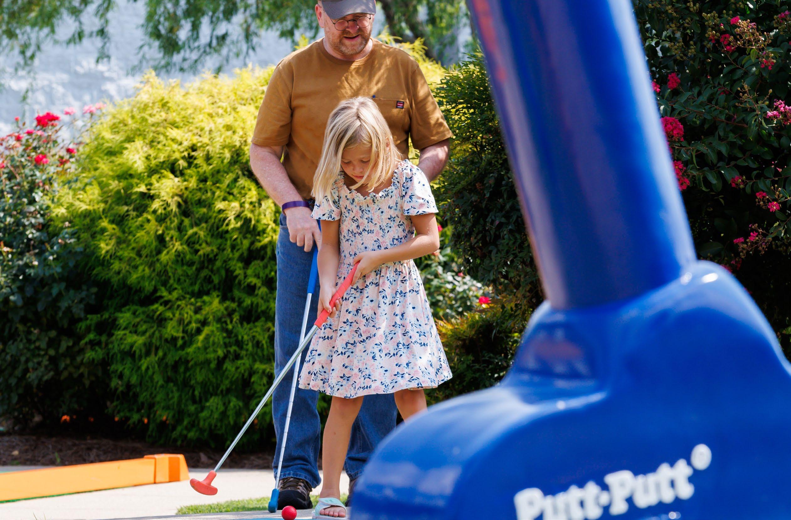 Vance Bishop and his great niece, 7-year-old Evelyn Bishop, enjoy their day on one of the two courses at the Putt-Putt Fun Center in Fayetteville on Aug. 16, 2024.