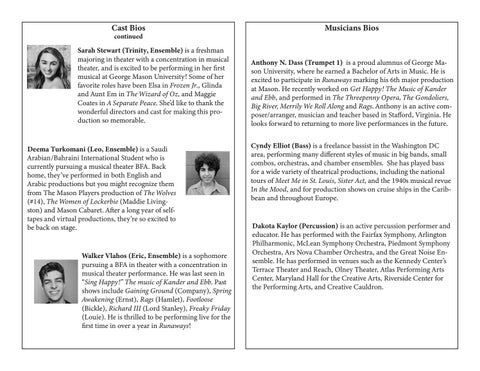Deema Turkomani (Leo, Ensemble) is a Saudi Arabian/Bahraini International Student who is currently pursuing a musical theater BFA. Back home, they’ve performed in both English and Arabic productions but you might recognize them from The Mason Players production of The Wolves (#14), The Women of Lockerbie (Maddie Livingston) and Mason Cabaret. After a long year of selftapes and virtual productions, they’re so excited to be back on stage. Walker Vlahos (Eric, Ensemble) is a sophomore pursuing a BFA in theater with a concentration in musical theater performance. He was last seen in “Sing Happy!” The music of Kander and Ebb. Past shows include Gaining Ground (Company), Spring Awakening (Ernst), Rags (Hamlet), Footloose (Bickle), Richard III (Lord Stanley), Freaky Friday (Louie). He is thrilled to be performing live for the first time in over a year in Runaways!