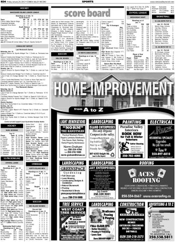HOCKEY VANCOUVER ISLAND JUNIOR LEAGUE Standings as of Jan. 14 North Division Team GP W L OTL PTS GF GA Comox Valley Glacier Kings 34 18 13 3 39 126 113 Oceanside Generals 33 15 16 2 32 110 136 Campbell River Storm 31 11 21 1 23 104 142 South Division Team GP W L OTL PTS GF GA Victoria Cougars 34 28 5 1 57 158 83 Saanich Braves 32 15 13 4 34 134 124 Peninsula Panthers 30 14 14 2 30 115 127 Kerry Park Islanders 32 13 17 2 28 110 132 Jan. 13 Kerry Park 2 Comox Vally 1 Jan. 14 Comox Valley 3 Oceanside 2 SO Jan. 21 Victoria @ Comox Valley 7:30 p.m. Sports Centre #1 CVMHA REP REPORT Last Weekend’s Games Saturday, Jan. 14 Happy’s Source for Sports Midget Tier 1 Chiefs vs. Peninsula loss 2-0 Rideout Construction Midget Tier 2 Chiefs vs. Peninsula tie 2-2 Comox Centre Mall Bantam Tier 2 Chiefs vs. Juan de Fuca loss 8-5 Courtenay Mazda Peewee Tier 1 vs. Juan de Fuca loss 8-0 Branch #17 Legion Peewee Tier 2 Chiefs vs. Peninsula loss 5-1 Brian Rice Toyota Atom A Chiefs vs. Victoria Racquet Club tie 3-3 Swift Datoo Atom B Chiefs vs. Cowichan loss 8-1 Sunday, Jan. 15 Happy’s Source for Sports Midget Tier 1 Chiefs vs. Juan de Fuca 9-1 Rideout Construction Midget Tier 2 Chiefs vs. Cowichan loss 6-2 Lube-X Fast Oil Change Bantam Tier 1 Chiefs vs. Powell River tie 4-4 Comox Centre Mall Bantam Tier 2 Chiefs vs. Kerry Park loss 5-2 Courtenay Mazda Peewee Tier 1 vs. Cowichan loss 12-0 Branch #17 Legion Peewee Tier 2 Chiefs vs. Saanich loss 7-1 Brian Rice Toyota Atom A Chiefs vs. Victoria Racquet Club loss 8-3 This Weekend’s Games Saturday, Jan. 21 Sports Centre #1 Lube-X Fast Oil Change Bantam Tier 1 Chiefs vs. Peninsula 12:152:15 p.m. Courtenay Mazda Peewee Tier 1 Chiefs vs. Saanich 2:30-4:30 p.m. Happy’s Source for Sports Midget Tier 1 Chiefs vs. Saanich 4:456:45 p.m. Glacier Gardens Brian Rice Toyota Atom A vs. Cowichan Valley 1:15-2:45 p.m. Sunday, Jan. 22 Sports Centre #1 Courtenay Legion Branch #17 Peewee Tier 2 Chiefs vs. Campbell River 1-3 p.m. Happy’s Midget Tier 1 Chiefs vs. Cowichan Valley 3:15-5:15 p.m. Glaciers Gardens Brian Rice Toyota Atom A Chiefs vs. Victoria Racquet Club 10:1511:45 a.m. Come out and support your local minor hockey teams