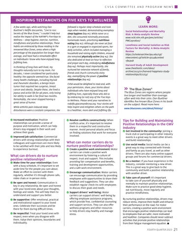 to take care of yourself physically and mentally to maintain positive relationships. Make sure to practice good sleep hygiene, eat nutritiously, move regularly and practice mindfulness. By nurturing positive relationships, drivers may reduce stress, improve their health and enhance their performance on the road. For motor carriers, creating a positive work environment that encourages positive relationships can lead to employees that are safer, more motivated and healthier. Companies should never subtract activities that promote positive relationships from their fatigue management equation. n FOURTH QUARTER 2023