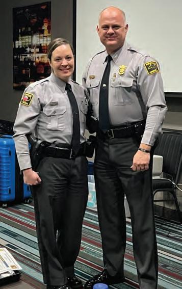Tpr. Kathryn R. Genao and Sgt. Michael G. Conley presented during the conference. Tpr. Genao was invited to share her story about a compliance investigation that led to the capture of a kidnapper. Sgt. Conley was invited to debut a post-crash trailer project. Col. Freddy L. Johnson Jr. awarded Tpr. Genao and Sgt. Conley each with a colonel coin for their efforts and hard work. n