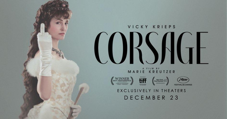 This year’s Palm Springs International Film Festival features Corsage (2022), directed by Marie Kruetzer. The charismatic Vicky Krieps (Phantom Thread) offers a boldly mischievous performance as the middleaged “Sissi” in this fiery, revisionist history of Empress Elisabeth of Austria, a woman once idolized for her beauty and renowned for inspiring fashion and exercise trends.