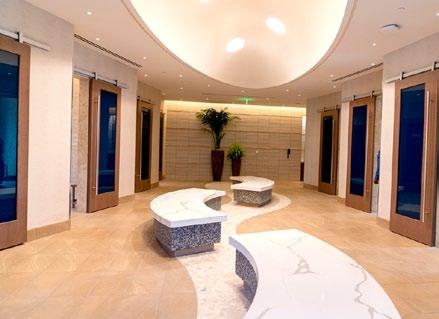pool area spanning nearly 17,000-squarefeet. Here, guests can dip their toes into the mineral water at the zero-edge pool or soak up the sun on the tanning deck with a fresh drink from the pool bar. The pool area also includes a waterfall feature and tranquil grotto, adding to the relaxing ambiance. Luxury cabanas are also available for those wanting to take their day of relaxation even further.