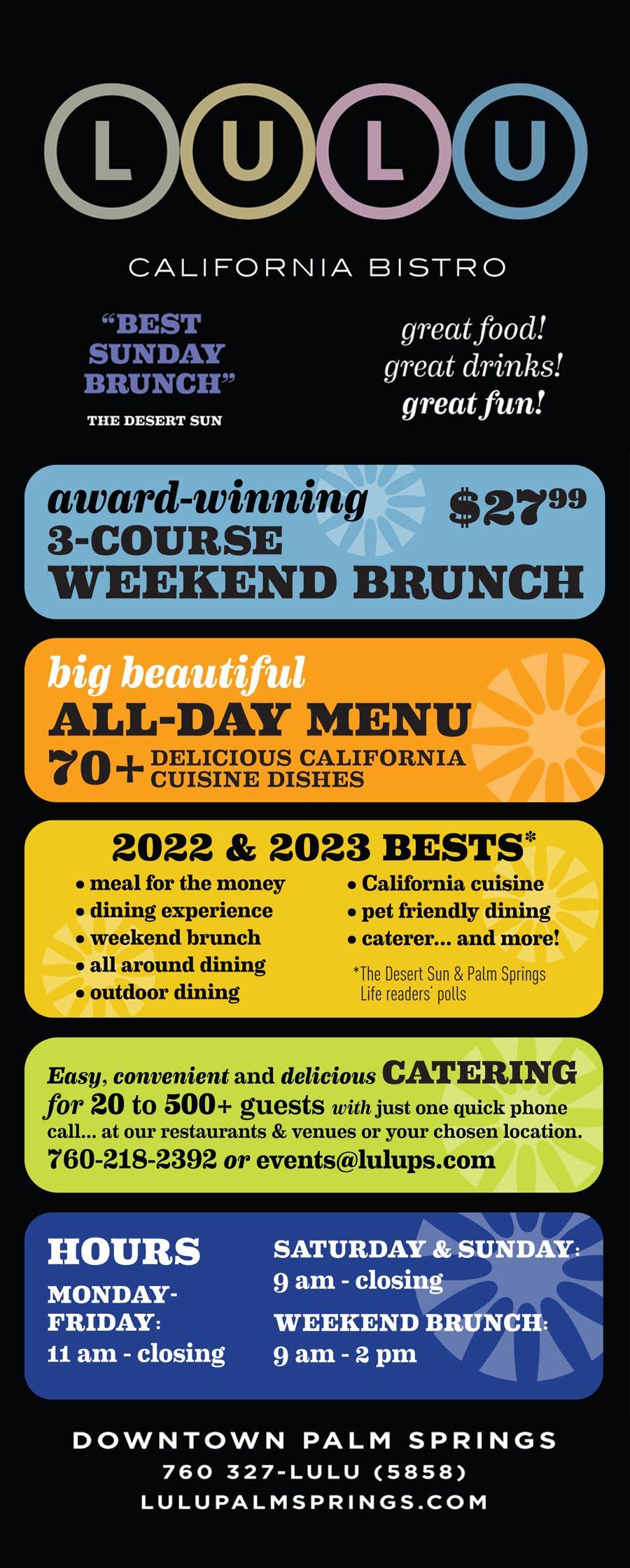 www.coachellavalleyweekly.com April 27 to May 3, 2023 21 15% OFF Daily From 2pm - 5pm With this CV WEEKLY Coupon EXPIRES APRIL 30, 2023. ONE COUPON PER VISIT.