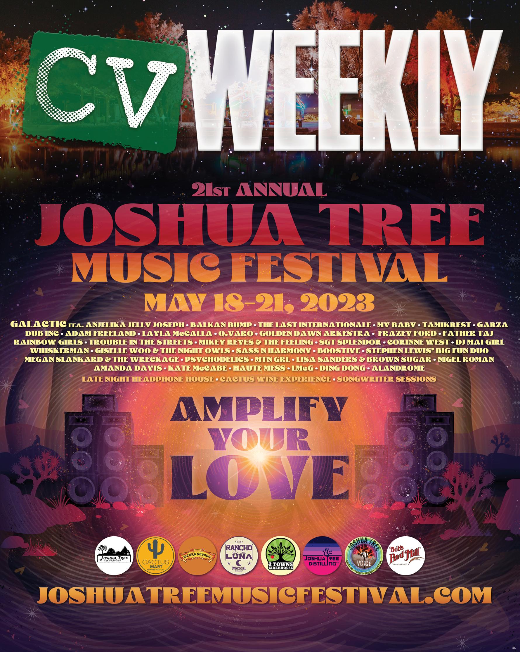 Just a stone’s throw from the otherworldly Joshua Tree National Park, Joshua Tree Music Festival has been drawing music lovers to the mystical Mojave Desert since 2003. The four-day festivals are immersive, communitycentric, family friendly, conscientiously inclusive experiences. Attendees are seasoned festival goers and first-timers alike, a passionate community coming together with a mission to experience social interaction on a deeper level, and foster positive, life-changing moments. Joshua Tree Music Festival happens each May and October. For more information go to www. joshuatreemusicfestival.com.