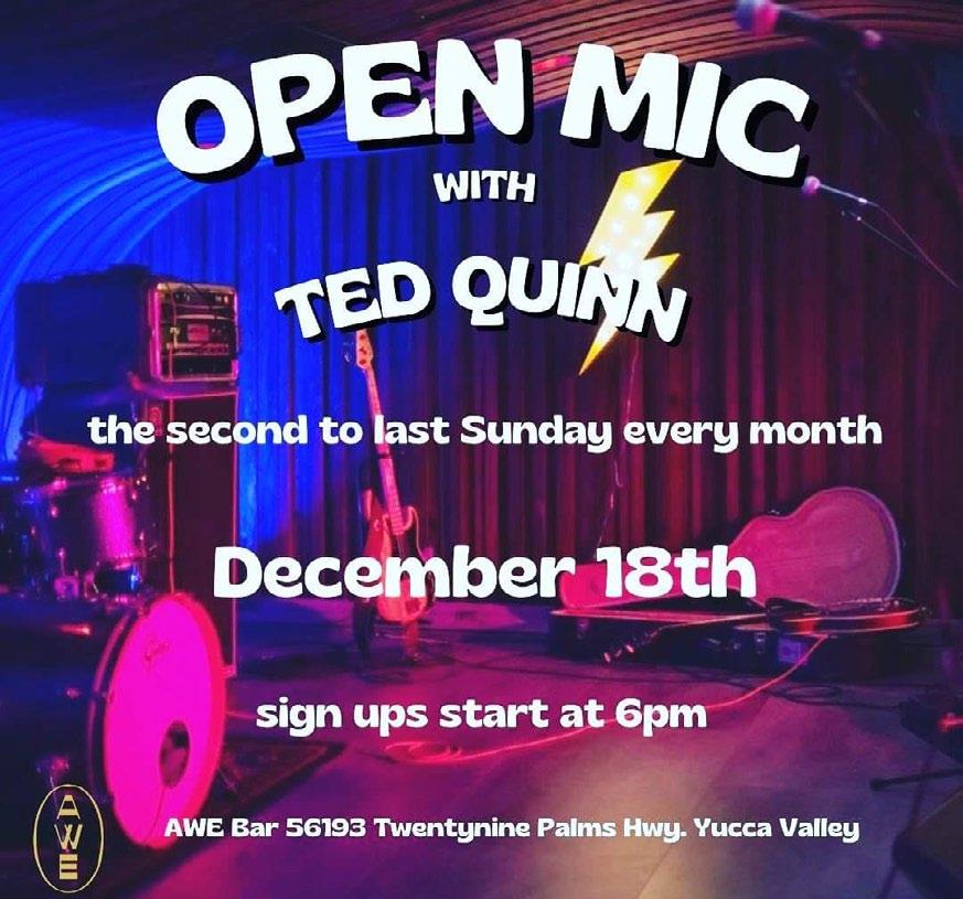 (OPEN MIC with Teddy Quinn debuts at AWE Bar on Sunday, December 18th, and will run the second to last Sunday every month. Sign ups start at 6pm. AWE Bar - 56193 Twenty Nine Palms Hwy, Yucca Valley)