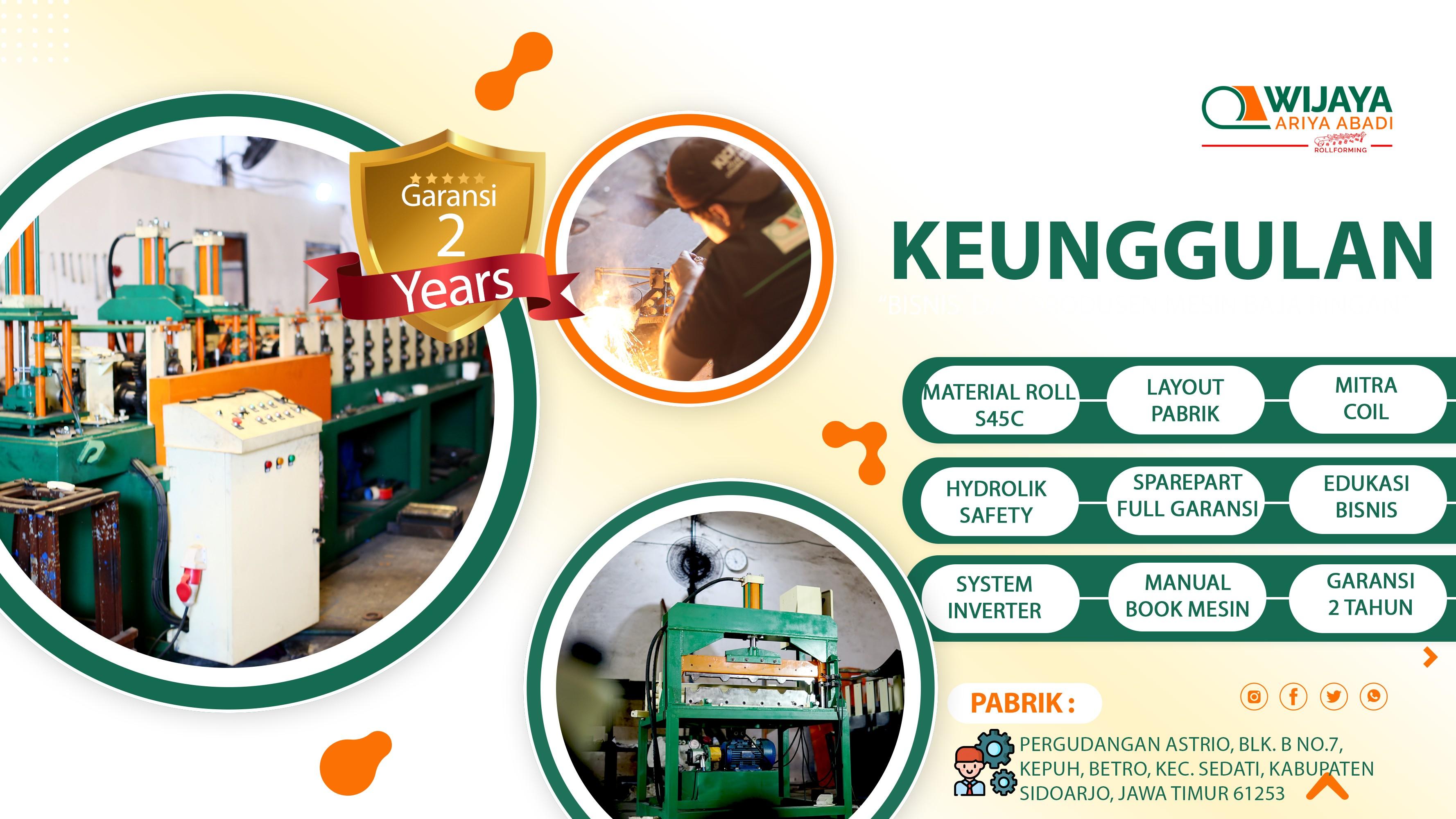 CV Wijaya Ariya Abadi, adalah pabrik mesin baja ringan yang berdedikasi untuk menyediakan solusi berkualitas tinggi dalam produksi mesin roll forming. Berdiri di bawah komitmen untuk memberikan solusi terbaik bagi pelanggan, kami telah membangun reputasi sebagai pemimpin dalam industri ini. Dengan berbagai keunggulan dan kualitas terjamin, tujuan kami untuk menjadi mitra ideal untuk memenuhi kebutuhan produksi baja ringan anda