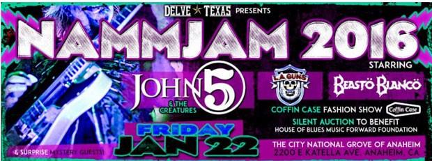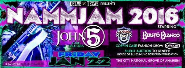 2016 NAMM Jam produced by Delve Texas was set again at The Grove in Anaheim California. This was a highly anticipated show with John 5 the guitar legend from Rob Zombie. This year’s NAMM Jam had a silent auction with all proceeds going to the House of Blues Music Foundation. Sponsored by Band Gear and Graphics, Musicians Institute, Guitar Grip, Guitar World, Minarik Guitars, Riva, Revolver, Blackstar Amplification, Coffin Case, and House of Blues Music Forward Foundation. Danny B with Clem Burke drummer of Blondie opened the spectacular show showcasing the phenomenal guitar skills comparable to the guitar picking legend Chet Atkins. They played mostly instrumental songs but did throw in a twist with David Vincent from Morbid Angel and Jerry Lee Lewis’s niece Anne Marie Lewis with a 'Whole Lotta of Shaking Going on'.