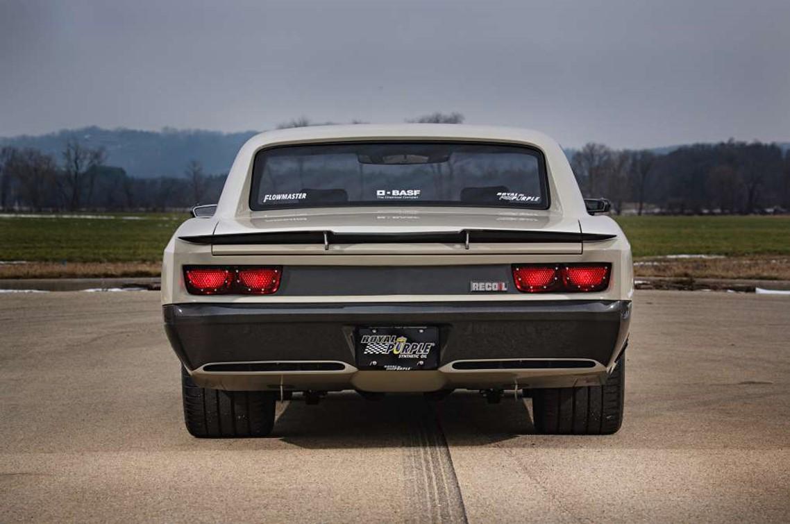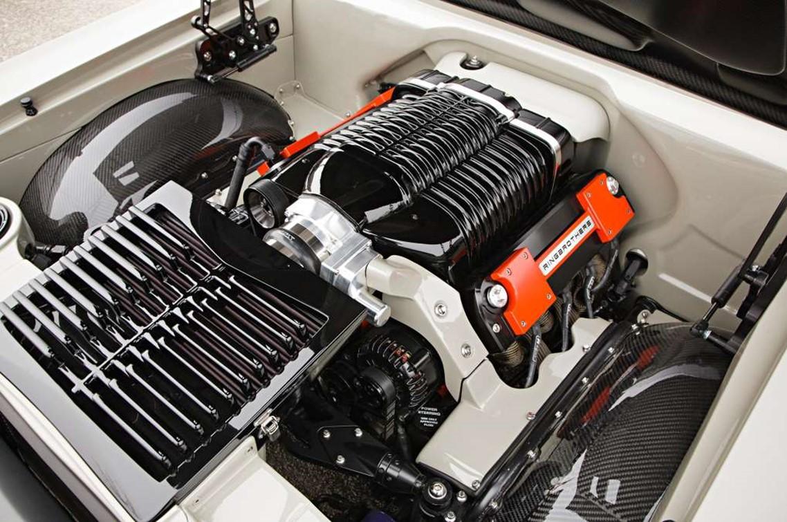 small-block form Wegner Motorsports. Based on an RHS block, the combo checks in at 417 cubic inches and utilizes Callies internals and RHS LS7 cylinder heads. A big Whipple twin-screw supercharger on top pressurizes the short-block to 1516 psi, which is good for 997 horsepower and just a smidgen under 900 lb-ft of torque. A Bowlerfortified Tremec six-speed manual trans is tasked with processing all that power, which it feeds rearward to a Johns Industries 9-inch rearend fitted with 35-spline axles. Sticking it all to the pavement is Michelin Pilot Sport rubber wrapped around HRE wheels (19x9.5 front, 20x13 rear) custom built to Ringbrothers’ specifications.