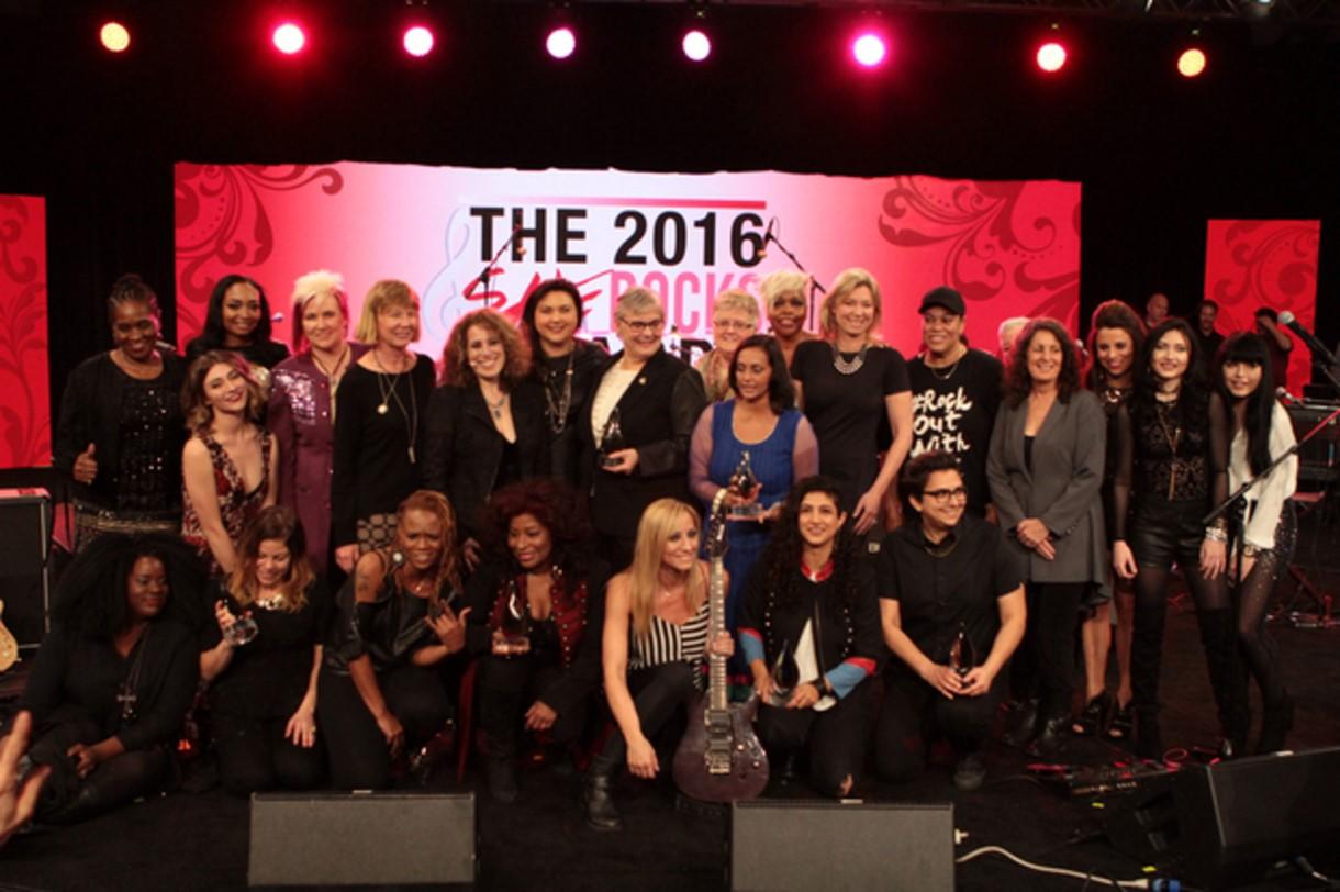 The 2016 She Rocks Awards, from left (top row): Rock Sugah guitarist, Kat Dyson; 2016 She Rocks Awards winner and Karmin singer, Amy Heidemann; guitarist, Malina Moye; 2016 She Rocks Awards winner and guitarist, Jennifer Batten; 2016 She Rocks Awards winner and Seymour Duncan founder/CEO, Cathy Carter Duncan; She Rocks Awards Founder and Co-Host, Laura B. Whitmore; 2016 She Rocks Awards winner and