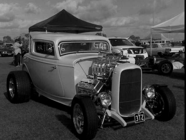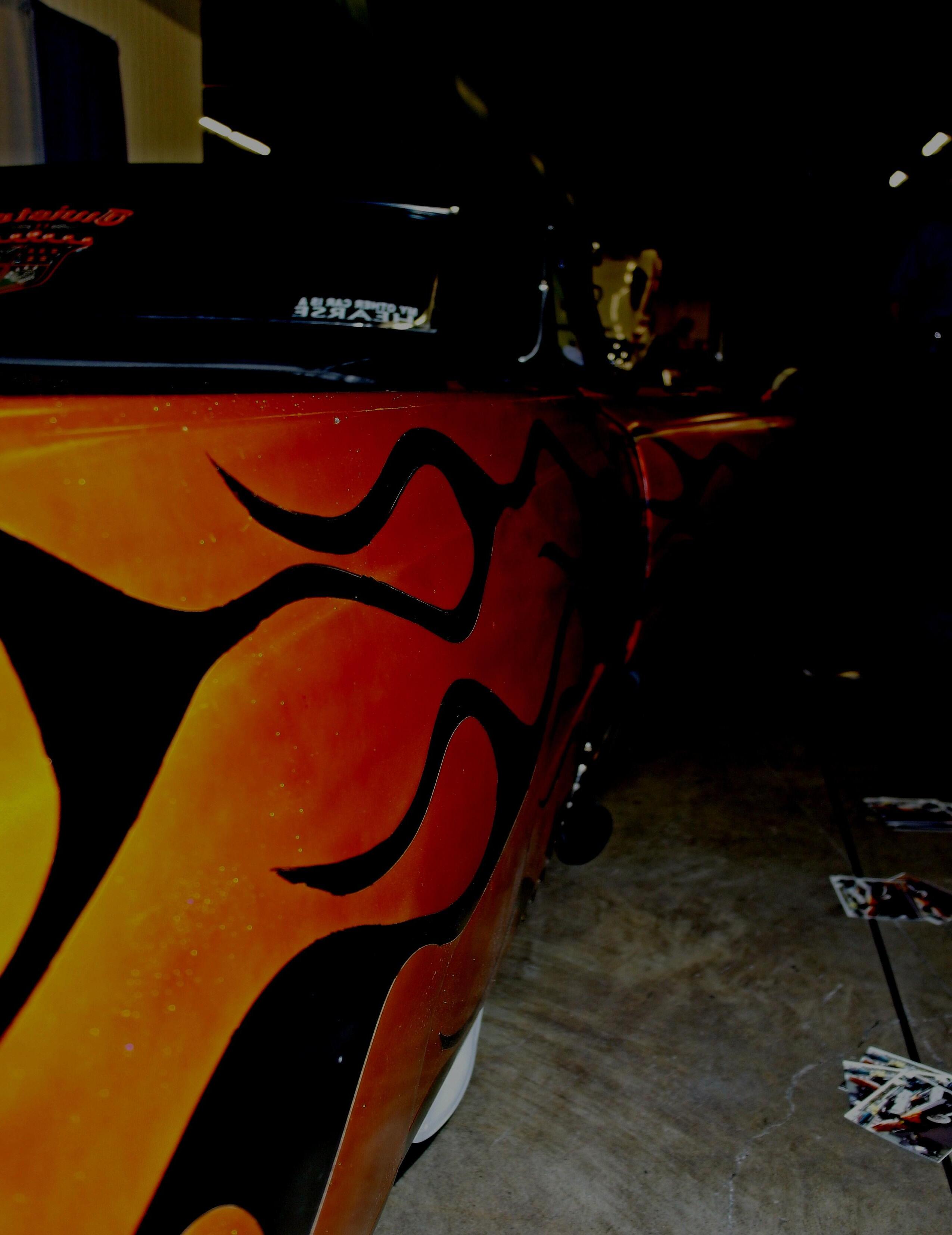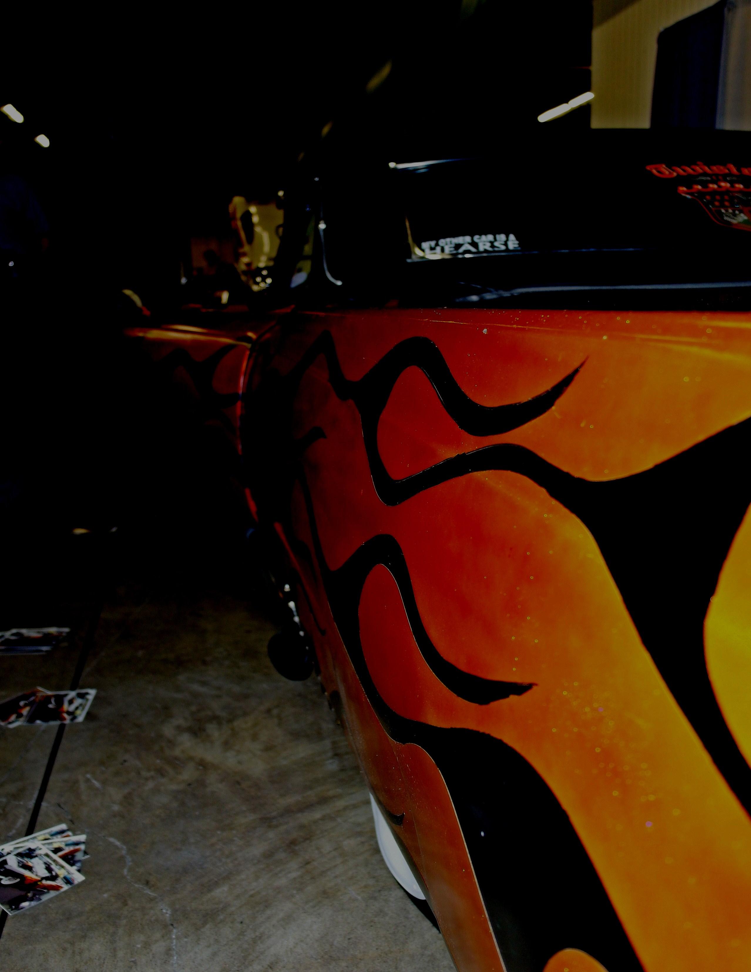 “You hear the sound of distant thunder, and you think "wonderful, another Pacific NW rainy day". The second thunderclap makes you furrow your brow; this thunder sounds different, almost feels different. The third rumble and the hairs on the nape of your neck begin to rise; it is then you realize, that isn't thunder. Fear grips you when you hear the roar yet again, a guttural sound, angry and menacing, bent on destruction. What was now distant is edging closer to you, like the predator that stalks you, relishing in your apprehension, tasting your fear, lips curled back in a snarl. Your subconscious mind starts to scream deep within the recesses of your soul, a cry of anguish at your impending doom, as in the distance you see the headlights come over the horizon. The car moves slowly, deliberately, knowing with every fiber of its steel body, every beat of its 350 cu inch heart, that you are the prey. With no sense of urgency it moves to you, savoring the chase, the ease of its movement casual but at the same time inevitable. You back away in fear, your body shaking, then bump into a wall; it takes a few seconds for your mind to register the fact that there is no place to run. You react like a caged rat, your eyes darting back and forth, desperately searching for a way out, a way to salvation, a way to live. And still the car continues its inexorable glide to you; another blast of thunder rattles your bones to the core, and you resign yourself to the truth that there is no escape. The car will have you, it will consume you, it will...savor you. It moves into the light, and you gasp in horror. Twin horns adorn the front grill, spikes built to impale it's victims like pincushions. Lazy, half closed eyes peek from the blowers of the motor, like the eyes of a shark that roll up into the skull during a kill. Silver skulls top the lights, grinning macabre masks, taunting you with their malevolence. Old license plates surround the engine, debris of kills gone by, reminders of the futility of past attempts of escape. The black carson top covers the driver in darkness; you can only assume it is a demon from the pits of hell, grinning with fangs covered in blood, fire in its soul, evil in its heart. As if to confirm your suspicion, you notice the flames along the side of the vehicle; not normal flames but black flames, dark like the night, like the soul of the driver, black flames that burn their way through an orange car, not the other way around. It is then you notice the rumble seat, and the poor unfortunate souls who didn't escape the last feeding. Hank and Peggy sit in the back, devoid of flesh yet preserved in bone, her hair still coiffed, his tux hat still on his head, their empty skulls leering at you in delight, almost as if they enjoyed their destruction. Silver