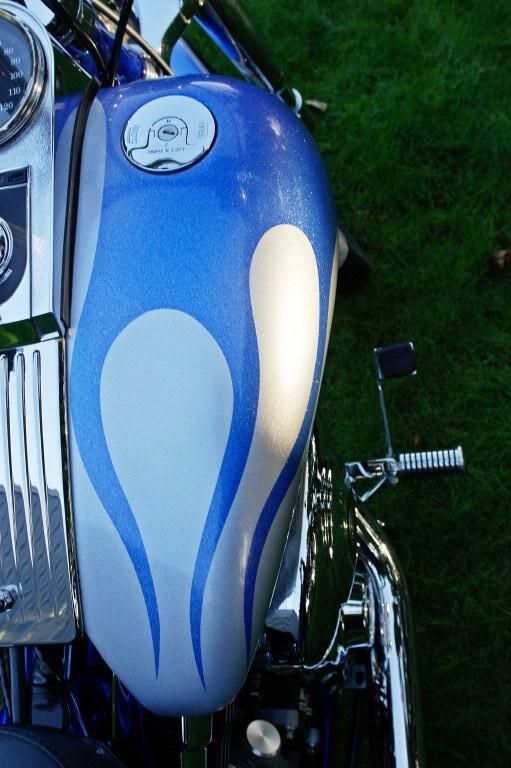 Paint: Blue over Silver with silver and maroon micro sequins, Blue pearl draw flames in clear coat