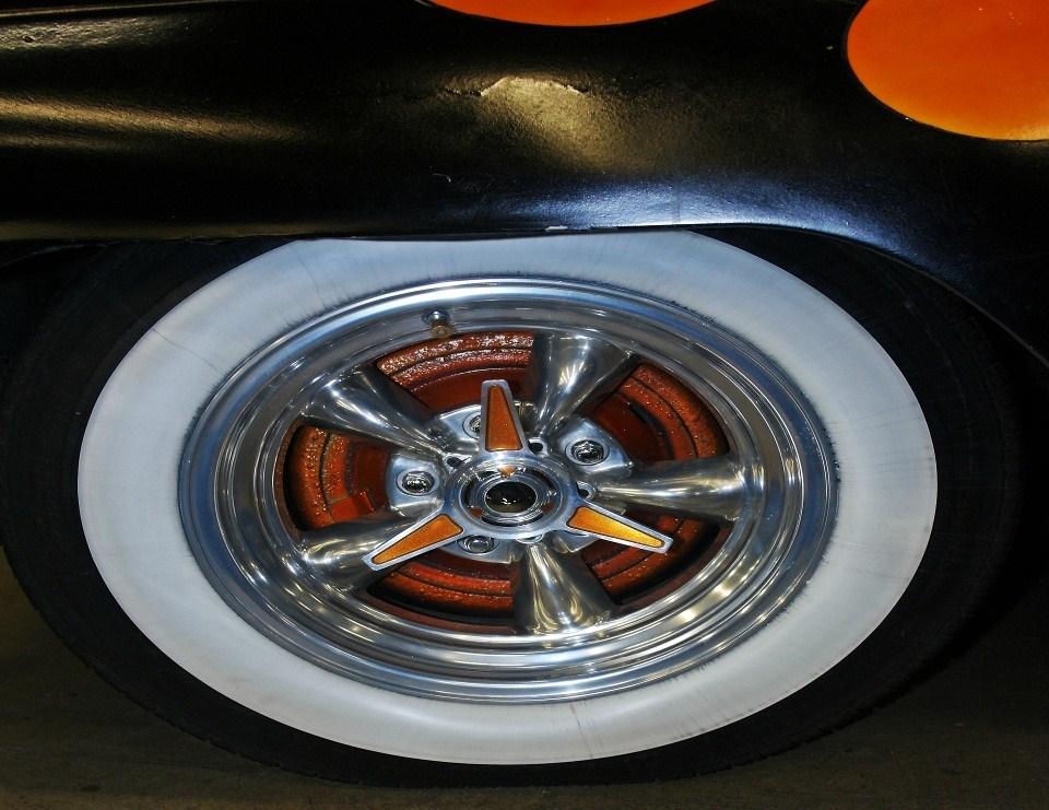 Rear: 17 x 160 Wheel with solid rim, custom cut and shaped 1970’s HD Flip up fender, 1940 Tail with glass lens