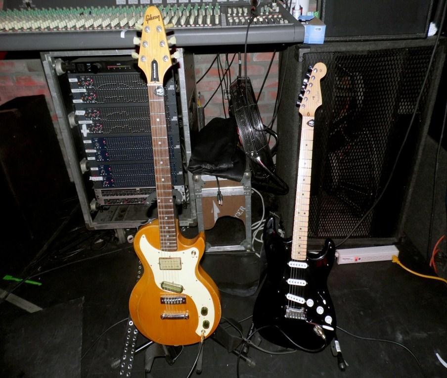 2004 Fender 50th Anniversary Stratocaster - An all-black American made Stratocaster with Custom Shop '54 pickups and a C-shaped neck. I've fitted it with a thick black pick guard and a switch to turn on the neck pickup in any position. In the spirit of David Gilmour, I've also shortened the tremolo arm for more subtle and precise control. It's been my "main" guitar for a while as I like how clear the guitar sounds with just the right amount of punch.