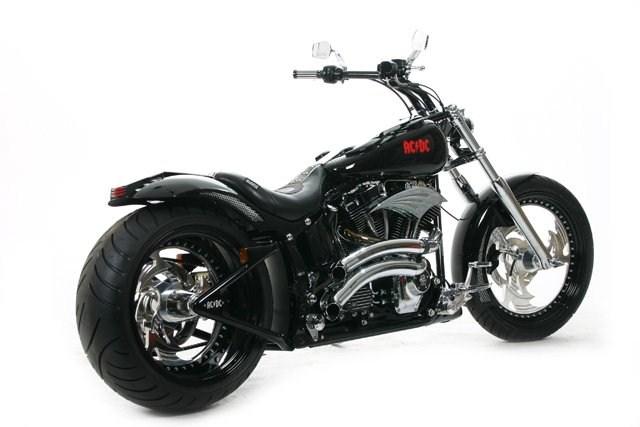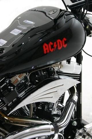 Harley-Davidson Twin Cam, stock carb with Mo Flo air cleaner, LA Choppers 2-into-2 exhaust pipes, 5 speed gearbox, stock primary drive assembly, one-off inspection cover with AC/DC logo.