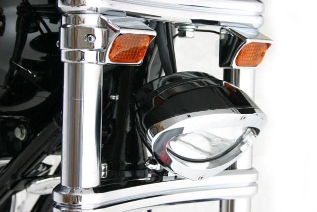 Stock length Pro-One telescopic forks in Accutronix yokes with integral 7degree rake, on-off black anodized 3‖x21‖ wheel by Rick‘s, single Harrison Billet-6 caliper, slotted disc, Zodiac pullback tee handlebars.
