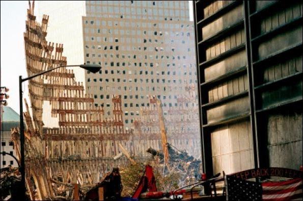 The most potent symbol of the events that happened on September 11, 2001 are pictures and videos of planes flying into buildings, of the Twin Towers of the World Trade Center engulfed in smoke and later collapsing and of people falling from buildings. Pictures taken of damaged buildings and relatives looking for loved ones in the days and weeks after the attacks are also often shown. The flag of the United States is often displayed around images of the events on September 11, 2001. This is to remind Americans that their country remained strong in the face of massive terrorist attacks.
