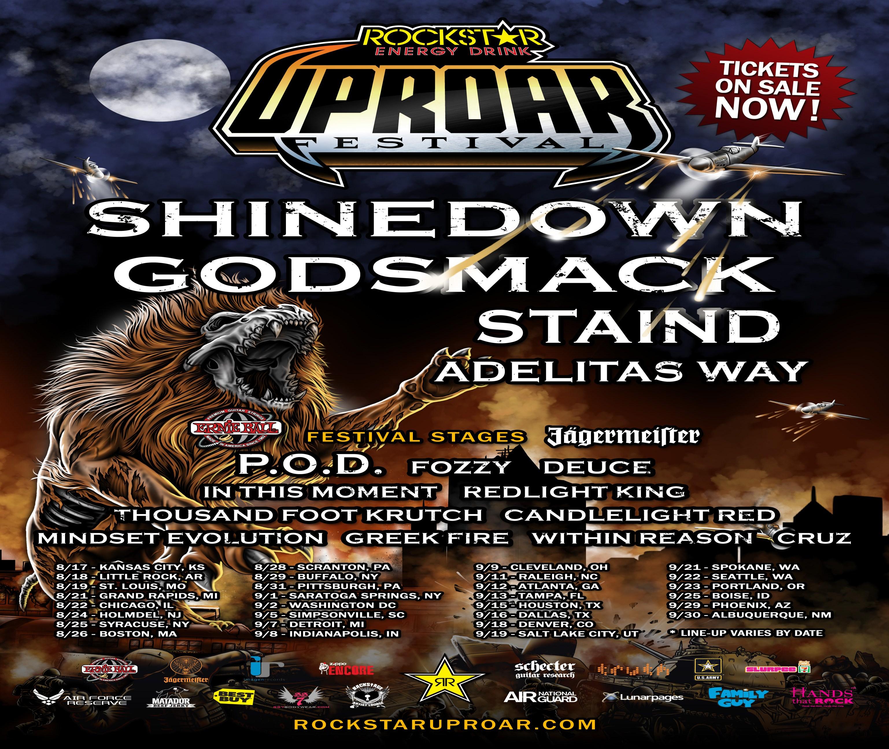 The Rockstar Energy Drink UPROAR Festival main stage will feature performances from multiplatinum rock bands Shinedown, Godsmack, Staind and Papa Roach, along with breaking band Adelitas Way. In addition, the Ernie Ball Stage and Jägermeister Stage in the festival area will include performances from multiplatinum headliner P.O.D., as well as up-and-coming artists Deuce, Fozzy, Redlight King, Mindset Evolution (winner of the 2011 UPROAR Battle Of The Bands), In This Moment, Thousand Foot Krutch, Candlelight Red and a local Battle Of The Bands winner.