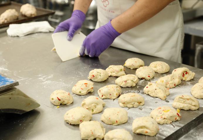 鍵的保健之道。烘焙師傅將青椒、紅蘿蔔等切成細末揉入麵糰,佐以