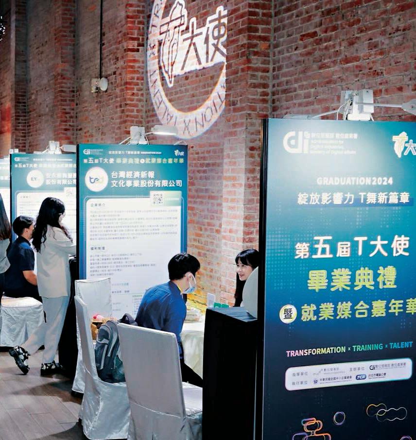 因應企業數位轉型需求、透 過數位青年人才培育解決轉型 人才缺口,數位發展部數位產 業署推動「數位青年 T 大使推 動計畫」(以下簡稱 T 大使計 畫),整合產官學力量,培養 具備跨域能力的數位青年,強 化其就業所需的數位即戰力,