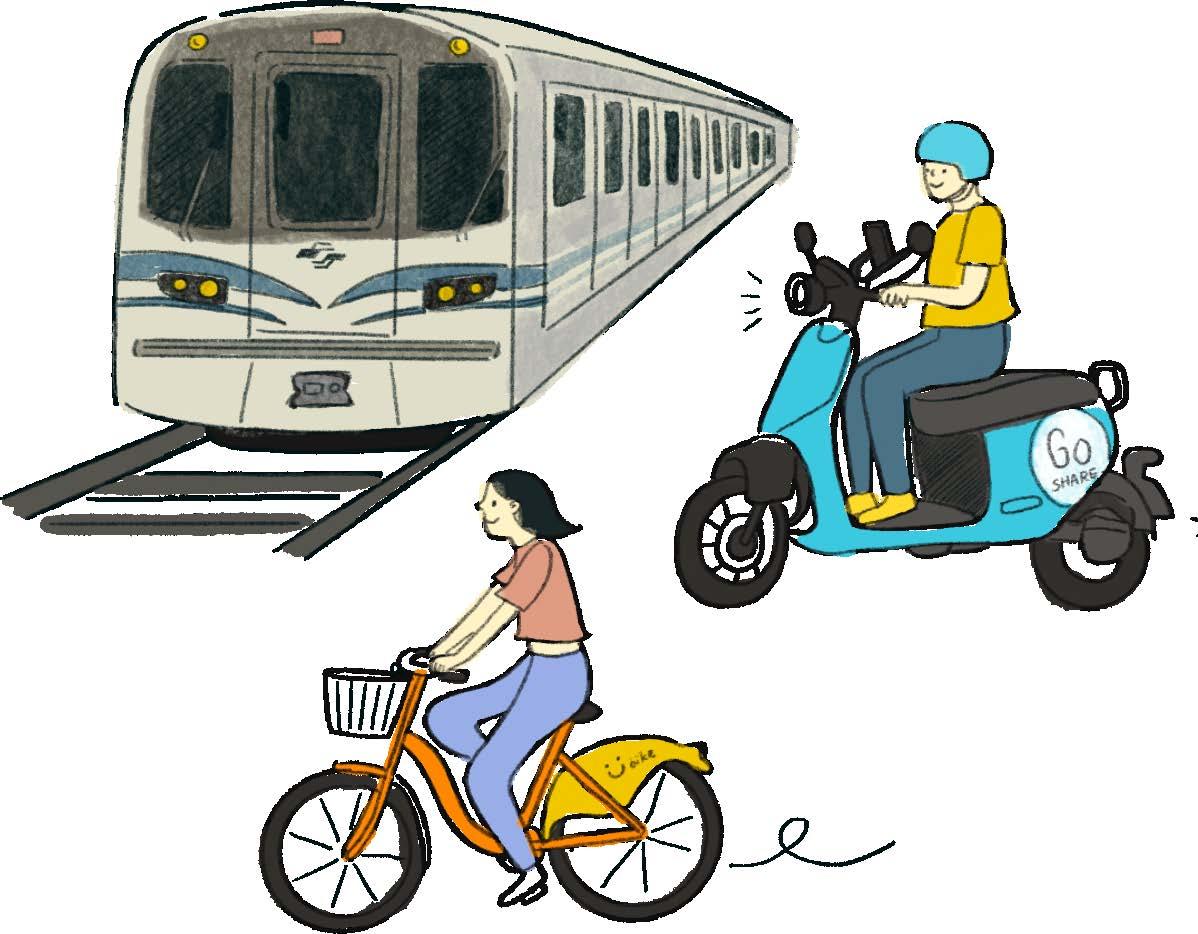 綠色移動指的是使用環保的交通方式,大眾交通工具、共享 單車或電動車。受惠於數位科技的創新,出門前用手機就能 輕鬆查詢好最佳交通接駁方式,下捷運、公車之後就能就近 跨上共享單車、電動機車直達目的地,既環保又避免塞車。