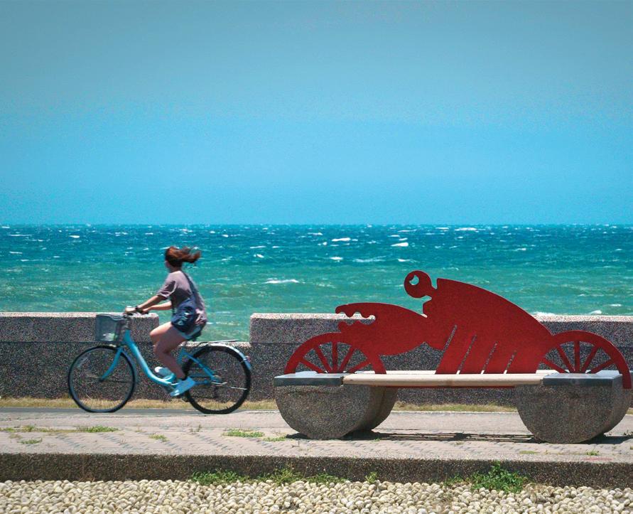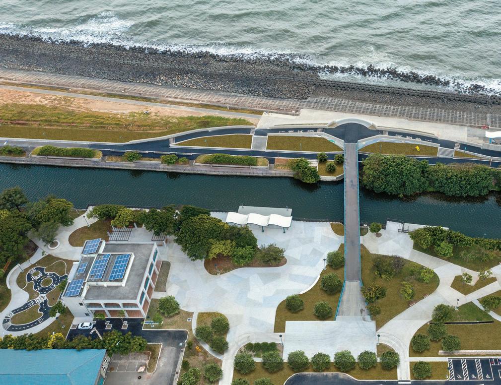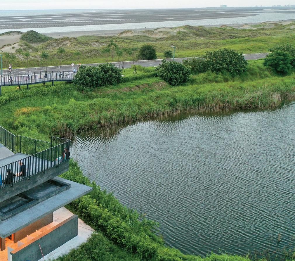 因此新竹市政府「微笑水岸計畫」中的「17公 里海岸整體水環境改善計畫」,定錨「生態旅 遊」方向,以理解景觀、生態的觀點,重新梳理 17公里海岸線沿線資源,在不破壞原始生態、 自然景觀的前提下,設計完善的自行車車道基礎 設施及串聯系統,營造濱海道路舒適順暢的騎乘 空間、讓人樂於親近的水岸環境。