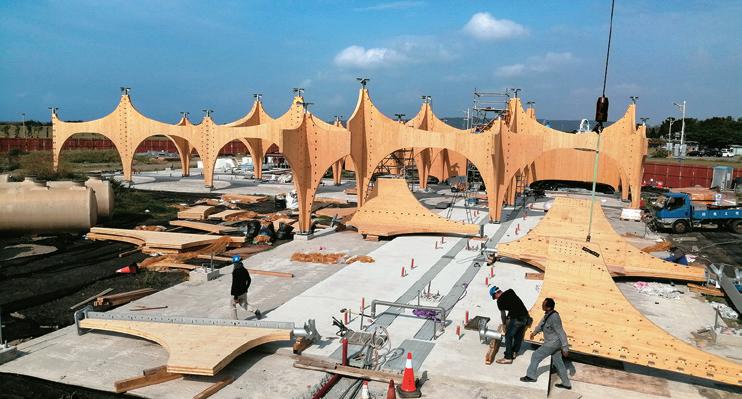 新竹夢想之地HSINCHU CITY, THE WONDERFUL LAND 168 週末假日,攜家帶眷的家族遊客、拎著冰箱有 備而來的豪氣買家、來海邊約會順便吃美食的 情侶、上班族紛紛湧進,吃喝買玩,人氣沸騰。 法國哲學家笛卡兒說「我思故我在」,逛市集 的人們是「我見即我食」,喜歡就吃,想要就 買,充滿即性樂趣。吃飽喝足後還可以到17 公里海岸線走走,落日沙灘遼闊寧謐,新竹人 逛海的日常,如詩般幸福浪漫。 c.屋頂是波浪狀的曲線,主結構則是拱形,讓內外視線 都具穿透性。 ( 李易暹攝 ) d.牆體運用近年新興的低碳 建材──CLT木材,其耐震強度媲美鋼筋混凝土,碳排 量卻大幅降低。e.波光市集-構成關係圖。 ( d-e.嶼山 工房提供 ) c