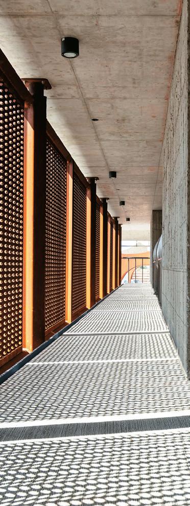 新竹夢想之地HSINCHU CITY, THE WONDERFUL LAND 164 考量海風烈日容易使得鋼構遭到鏽蝕,建築以 混凝土、集成材、耐候鋼、不鏽鋼、高壓混凝 土磚等材料構成,都是能隨著時間變化、有利於 後續維護管理的材質,搭配使用SRC打造外觀 的屋頂,則構成相對安靜的建築基調。建築迎風 面設計較大壁面,形成大面積遮蔭的半戶外活動 空間,冬天可以阻擋東北季風,背風面則加大開 口作為進出動線,便於人員進出移動。建築內 部打造各種尺度的視覺、人行穿梭及活動的開放 空間,配以水平延展的波浪狀大型頂棚及擋風牆 體,引進自然天光並抵擋、化消強勁風勢,營造 流動活潑、舒適宜人的空間氛圍。 對抗酷暑寒冬 引進天光流風 . a