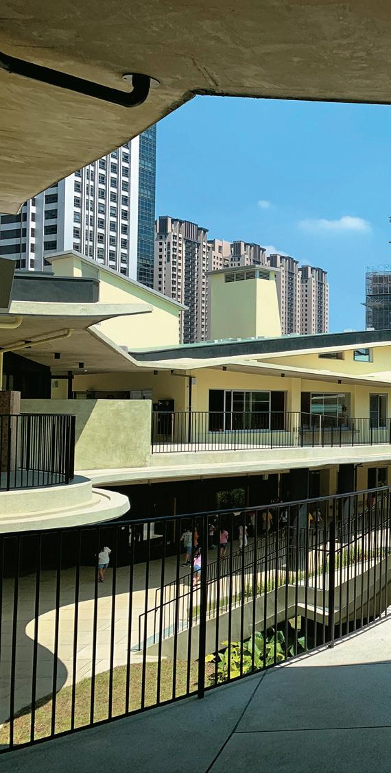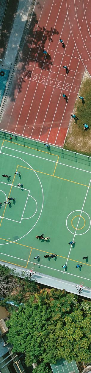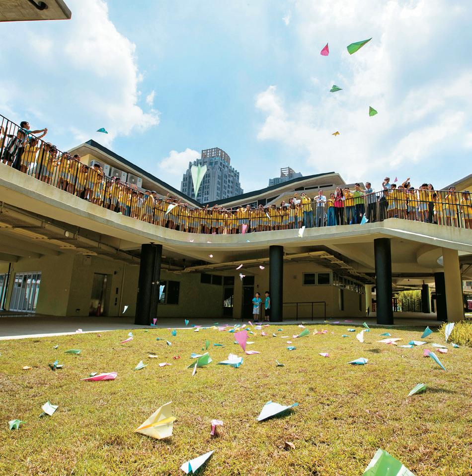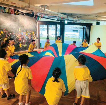 這是一所沒有環狀跑道的校園,也是一所可以登 上屋頂的校園。其實屋頂原本是設計給老師們 「放空」用的,讓老師們課餘有個完全放鬆的空 間,但老師們認為讓學生也能上來玩,後來屋頂 就成了小朋友快樂奔跑「放飛自我」的地方。