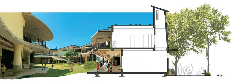 183 SCENE Ⅳ 新校園運動 整個學校都是孩子的遊戲場 d.三民國小附設幼兒園外觀。e.三民國小附設幼兒園剖面透視圖。 ( d-e林柏陽建築師事務所提供 ) e