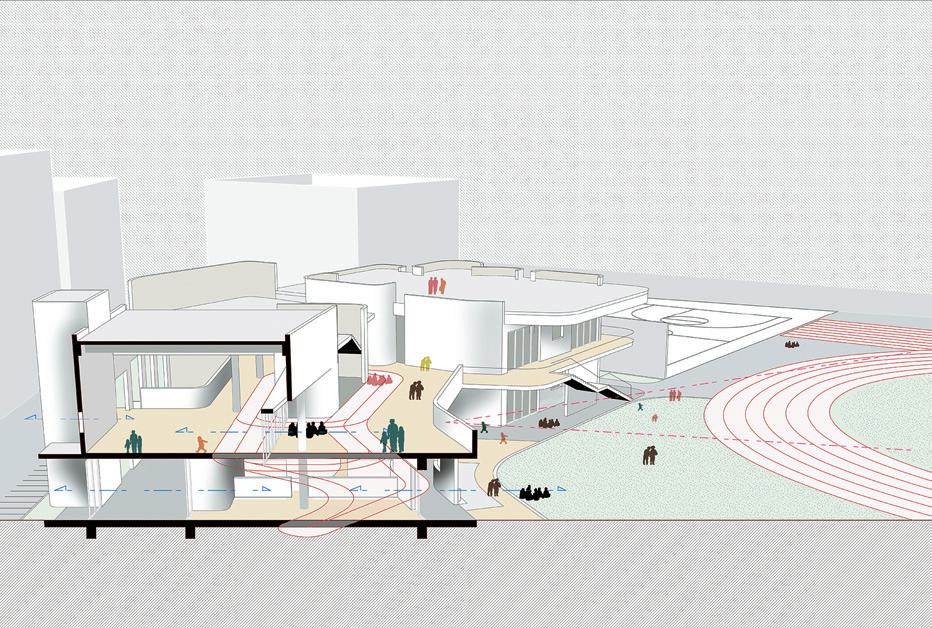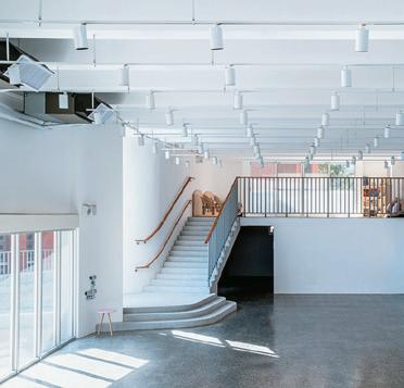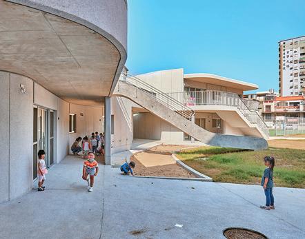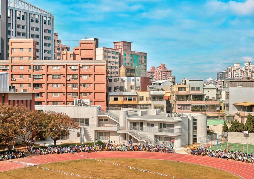 175 SCENE Ⅳ 新校園運動 整個學校都是孩子的遊戲場 「我們在創造的是一個場域,不是一幢建築,因 此不應只討論建築室內空間,邊界跟流通性是重 要的。」階梯廣場回填,原籃球場位移出足夠空 間,景觀邊界延伸至校園,也讓原本被鄰近彩虹 館遮蔽的園區基地獲得較佳日照。內部不採傳統 的方正設計,而是以4.5公尺挑高呈現,讓教室 與教室間連結的活動場域視野極寬闊,而且每間 教室都有前後落地窗不把孩子限制在小小的教 室中;寬闊內部空間搭配自然採光以及軌道燈, 讓圓弧牆面取代傳統梁柱。校舍以「立體遊戲 場」為概念,二樓設有寬闊露台讓孩子盡情活 動,還有兩層樓的溜滑梯融合其中,孩子可以透 過外牆雙層溜滑梯直接「下到一樓」,萬一發生 災害時,具備讓師生即時從二樓通往一樓空曠處 的逃生功能。 b