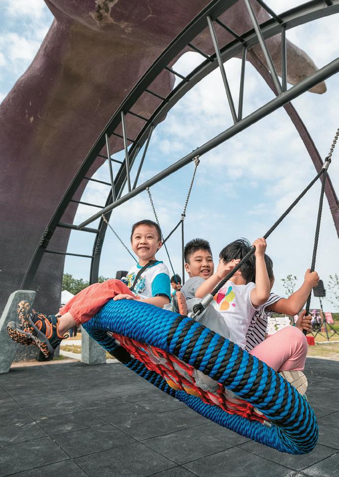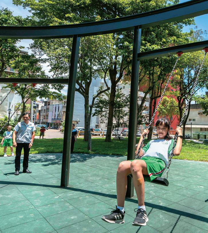 042 新竹夢想之地HSINCHU CITY, THE WONDERFUL LAND 八人共玩 大鞦韆 全台少見 . 位於隆恩圳旁的民族公園面積約3,600平方公 尺,是「進擊的公園」計畫第22座改造的公園。 此地是在地長輩天天報到、聯絡感情的好所在, 超過26年未經大規模整修,長年有低窪積水、 水泥及高壓磚鋪面凹凸不平、設施老舊或被雜物 占用等問題。 市府啟動改造計畫改善,規劃三大目標,包括: 「要便於通行」,全區設計無障礙步道,讓小 孩、老人、身障者方便進入。其次「要有特色」, 公園正中央舊有籃球場架改設為全台絕無僅有 的環狀鞦韆場,可供八個人同時盪鞦韆,成了一 大亮點。最後「要保留大樹和綠地」,修剪梳理 原有植栽,加種開花性植物,創造各季節不同特 色,減少硬質鋪面,增加草地綠蔭,讓市民忙碌 之餘能歇喘一口氣,享受公園帶來的自在綠意。 a a-c.民族公園將舊籃球架改設「環狀鞦韆場」,成了一大亮點。 ( a.黃聖凱攝、b.陳運奇攝 )