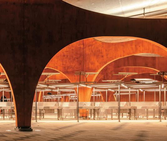 新竹夢想之地HSINCHU CITY, THE WONDERFUL LAND 166 建築設計大獎 常勝軍 國內外 . 景觀鋪面以高壓混凝土磚、植草磚、卵礫石及 抿石子收邊,以八種深淺交錯的基本單元,在 720公分見方的鋪面模矩中組合變化,順應海 岸軸線,直接穿越建築,綠地與廣場邊界模糊 漸變,創造內、外視覺穿透的空間自由。 照明設計方面,不採直射光,而是節制地由下 投射打亮頂棚,重點勾勒牆體拱型輪廓;攤商 設施照明則予以強化,讓攤商所在的位置與陳 列商品,在夜間形成由內透亮的發光體,與切 削的頂棚交互輝映,形成內外光影曲線流動的 市集場域。極具特色的建築外型連連獲獎,包 括國家卓越建設獎最佳規劃設計類金質獎、德 國iF建築類別設計獎,在行政院農業委員會 110年度優良農業建設工程獎得獎名單中,波 光市集勇奪漁業建設類別唯一優等獎;2022 a-b.嶼山工房提供:丰宇影像攝。 a