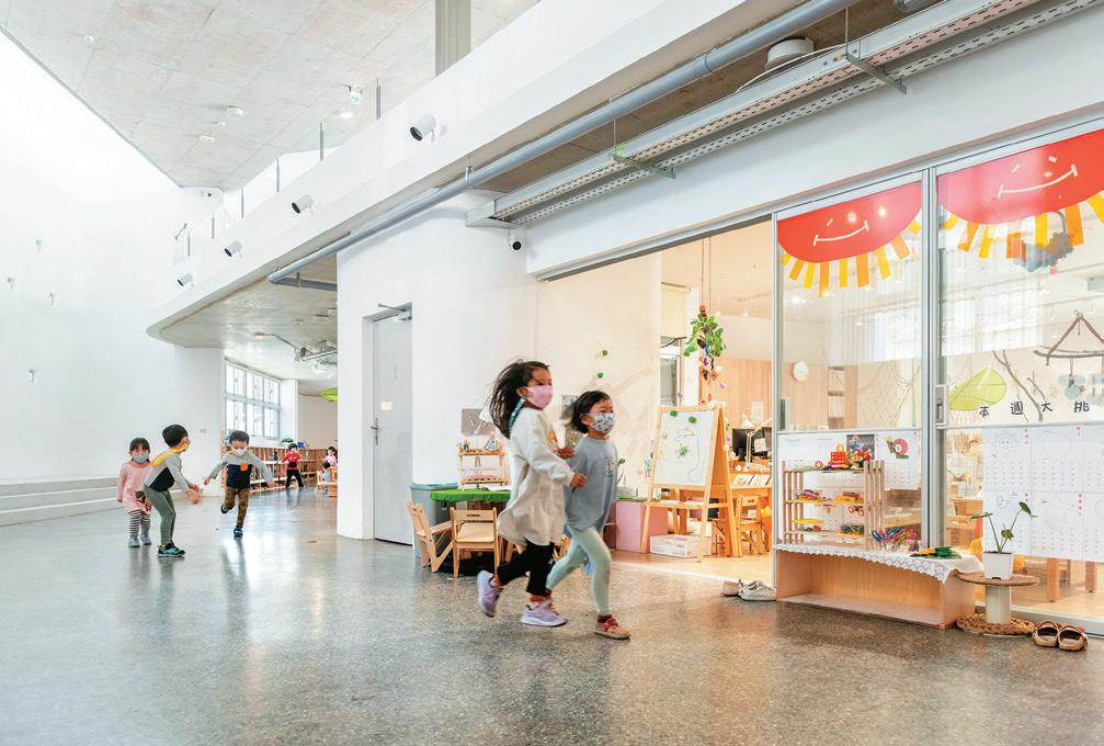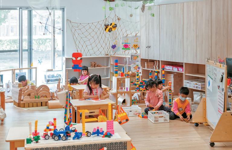 則,絕對是安全至上。在「三民國小附設幼兒園 改造案」中,為了防止幼童碰撞尖銳的牆體邊緣 發生危險,設計了連續性的弧形迴廊空間,所有 結構牆都是弧形和直線的交錯組合,大幅減少建 築銳利邊角,避免了發生意外傷害的隱憂。看似 隨意揮灑的設計,其實發揮了很大的空間效率與 空間的自由流動性,滿足幼兒園大量的儲物收納 需求,牆面上與孩子視線等高處隨機開設幾處小