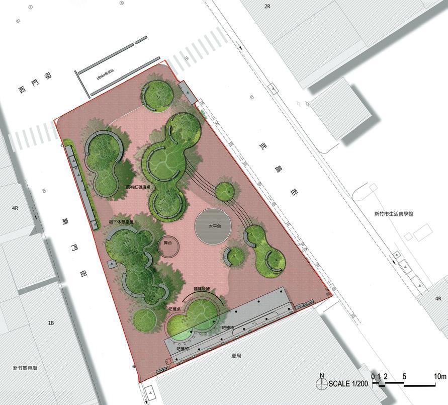 048 新竹夢想之地HSINCHU CITY, THE WONDERFUL LAND 規劃設計: 環藝工程顧問有限公司 / 致力於建築、室內、外與周遭環境之融合,創造 出優質美學的景觀創作,以「建築工學、都市空 間、景觀美學」為三大設計主軸,從大尺度的都 市空間至小尺度的人體工學尺寸,設計範疇鉅細 靡遺。 e d d.楊智仁攝。e.民族公園全區平面配置圖。 ( 環藝工程顧問有限公司提供 )
